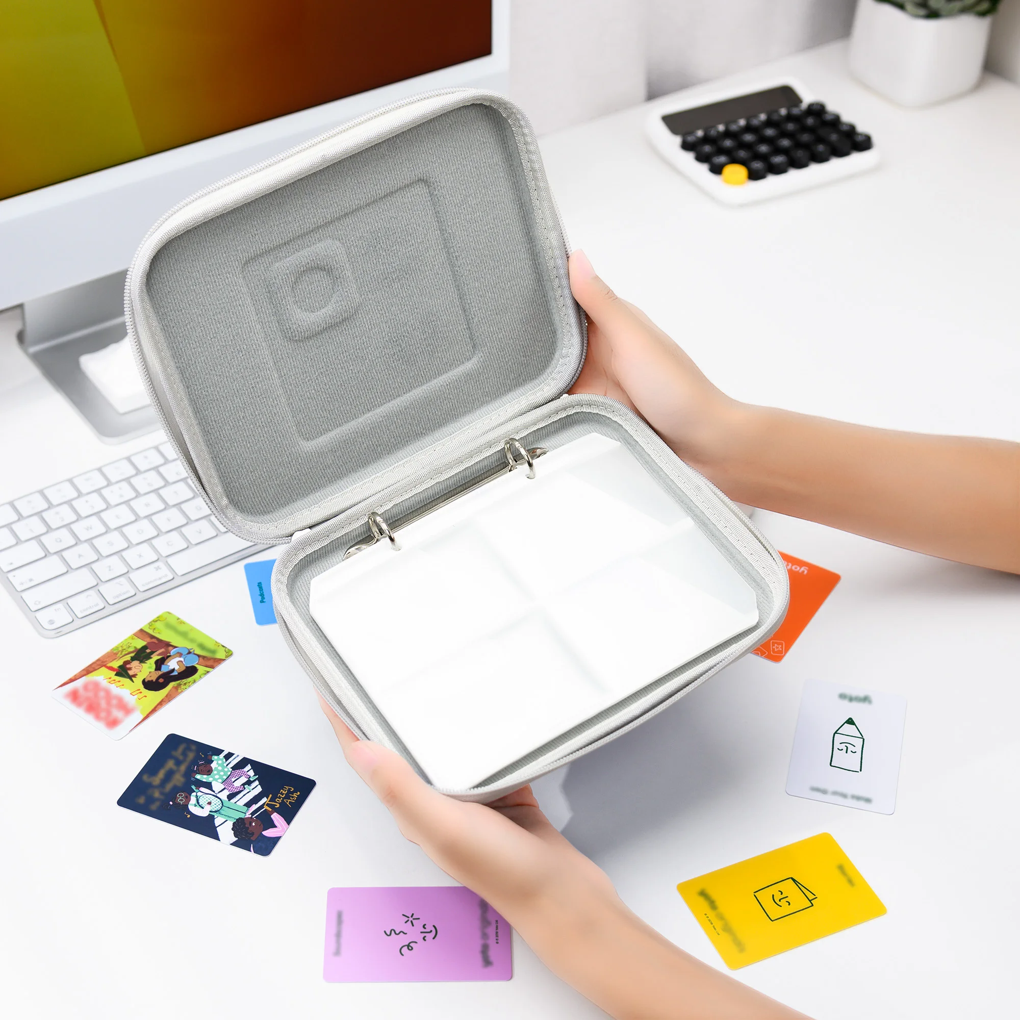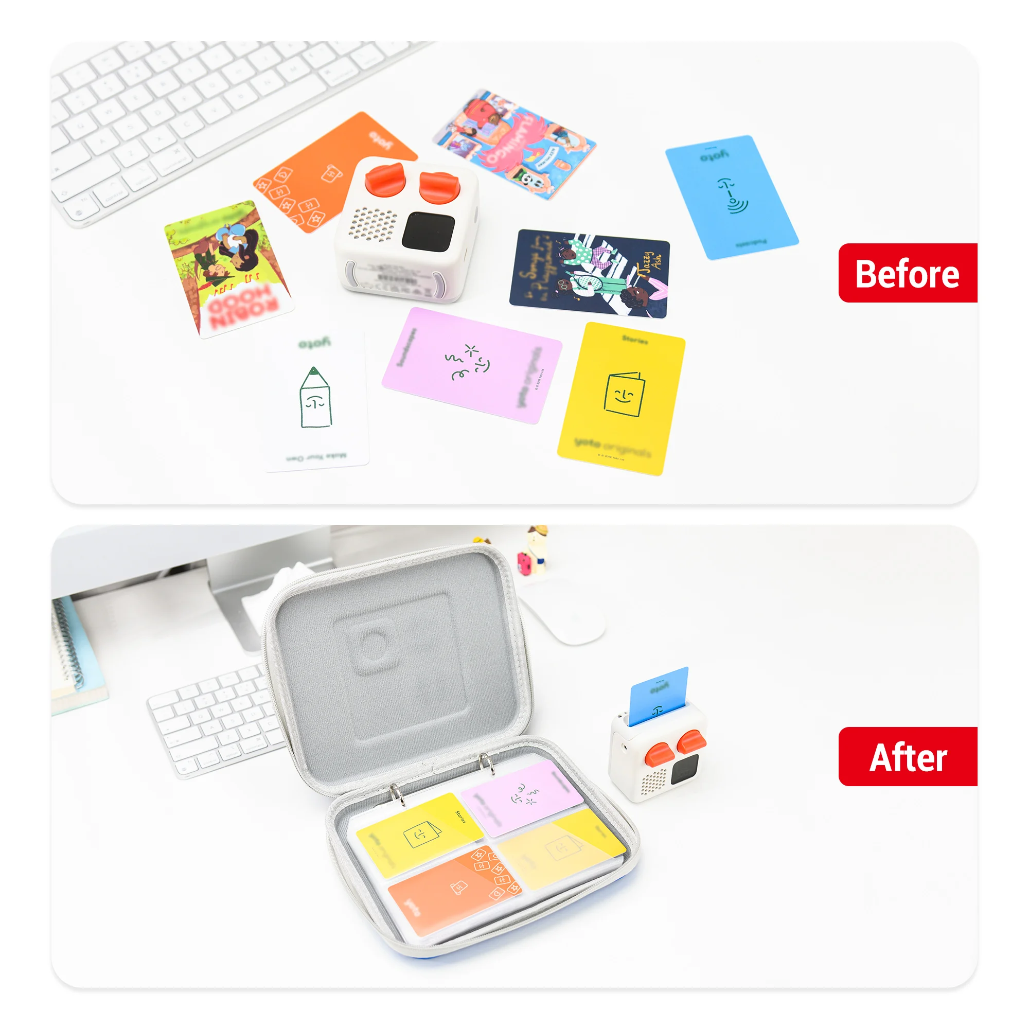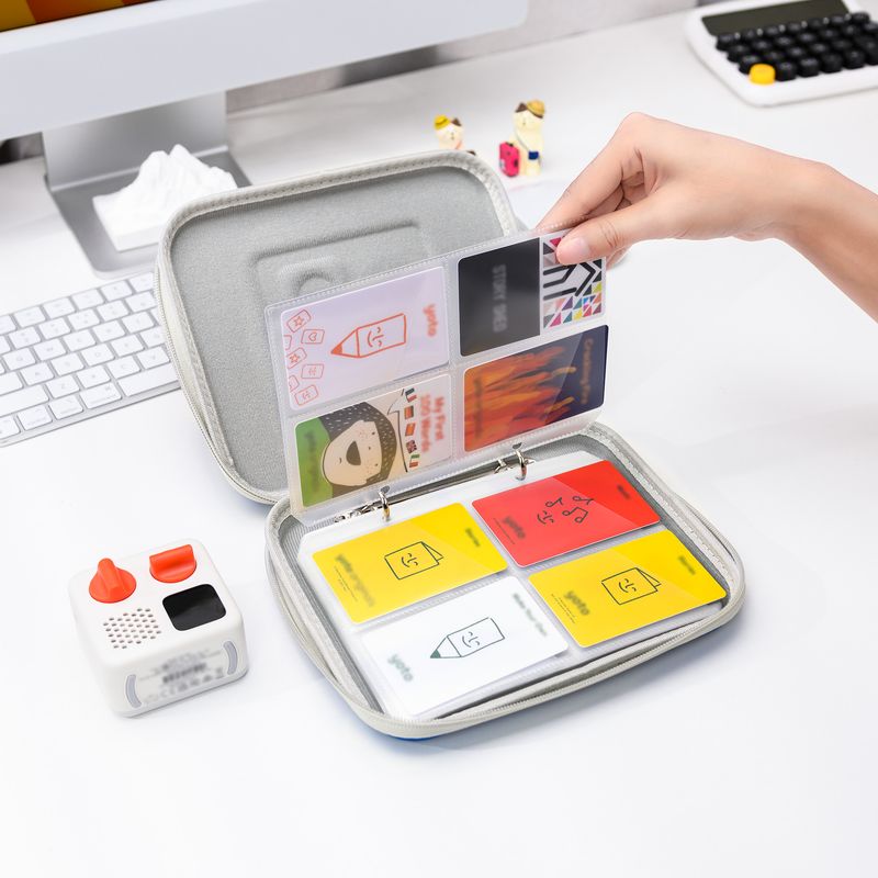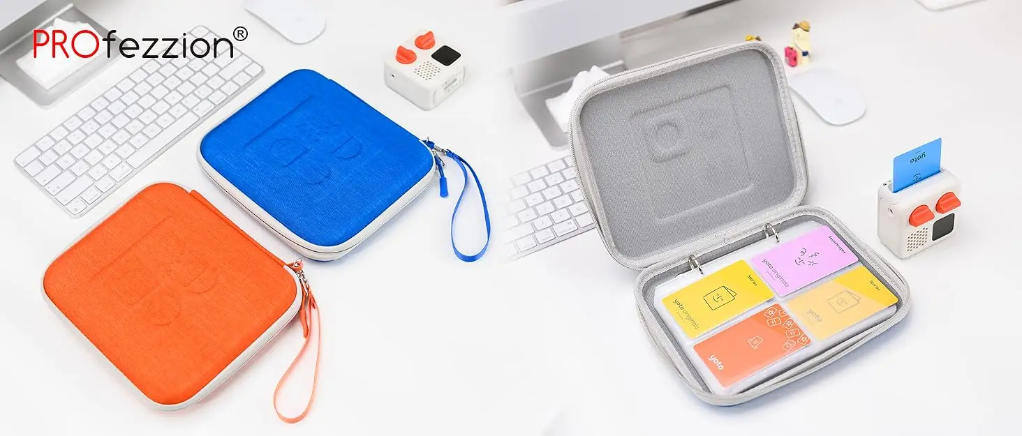The PROfezzion YT-88 Card Case is specifically designed for Yoto cards. It features 11 double-sided protective pages, each side holding up to 4 cards, for a total capacity of 88 cards, accommodating various storage needs. The transparent pages allow for quick card identification, making it easy to organize and sort. The angled pockets let children easily insert and remove cards. Made with premium EVA material, the outer shell is durable and resistant to external impact and pressure, ensuring card safety. A zipper closure and D-ring handle provide convenient portability. Measuring 206 x 170 x 40 mm, it fits easily into a child's backpack, allowing them to enjoy card content anytime, anywhere. Available in bright orange and blue, this case is vibrant and makes an ideal gift. Additionally, this case is suitable for holding business cards, credit cards, gift cards, and more, catering to various card storage needs and offering a convenient and organized storage experience.
