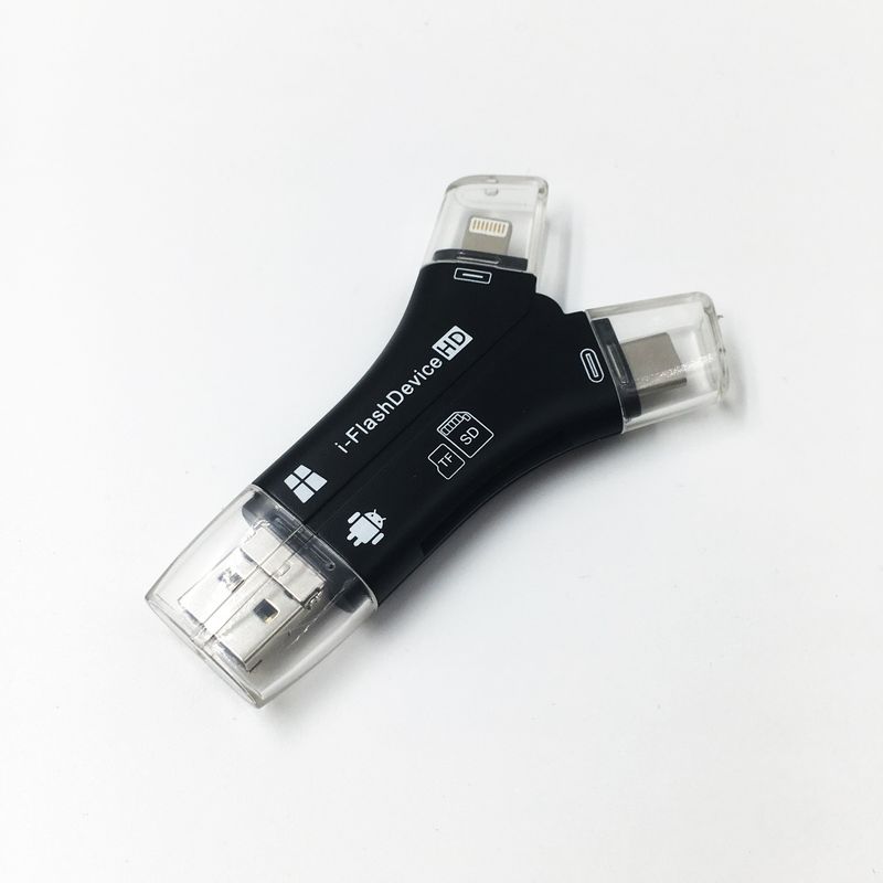 [I flash device 4-in-1 mobile phone card reader] is a card reader for Apple / Android / Computer / TYPE-C (Lightning / mirco / USB / TYPE-C) interfaces for all devices on all platforms, easy to implement External storage sharing, expanding the storage capacity of mobile devices, breaking the limit of mobile phone capacity, plug and play, storing your favorite photos, videos, movies and music into your mobile repository! Supports file encryption, protects privacy, rejects the high memory difference of Apple mobile phones, can directly take photos and videos and save them to TF / SD card, does not occupy mobile phone memory, convenient and practical, supports Apple 5 or more devices (iPhone5 / 5c / 5s / 6 / 6p / 6s / 6sp / 7 / 7p / 8 / 8p / X, iPad4 / 5 / mini2 / mini3 / mini4 / Air / Pro, iPod touch5 / touch6) and all Android devices with OTG function.