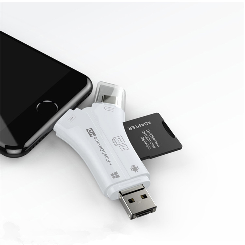 [I flash device 4-in-1 mobile phone card reader] is a card reader for Apple / Android / Computer / TYPE-C (Lightning / mirco / USB / TYPE-C) interfaces for all devices on all platforms, easy to implement External storage sharing, expanding the storage capacity of mobile devices, breaking the limit of mobile phone capacity, plug and play, storing your favorite photos, videos, movies and music into your mobile repository! Supports file encryption, protects privacy, rejects the high memory difference of Apple mobile phones, can directly take photos and videos and save them to TF / SD card, does not occupy mobile phone memory, convenient and practical, supports Apple 5 or more devices (iPhone5 / 5c / 5s / 6 / 6p / 6s / 6sp / 7 / 7p / 8 / 8p / X, iPad4 / 5 / mini2 / mini3 / mini4 / Air / Pro, iPod touch5 / touch6) and all Android devices with OTG function.