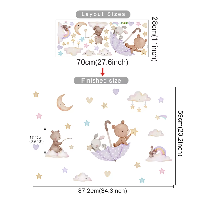 The wall stickers are colorful and full, with cute animals and soft tones of stars and moons perfectly presented. They also have excellent anti-fading ability and stay fresh for a long time. At the same time, they strictly follow environmental protection standards and do not release harmful substances, protecting the health of you and your family. It is not only a simple decoration, but also a symbol of innocence and beauty, injecting endless vitality and fantasy into your living space.