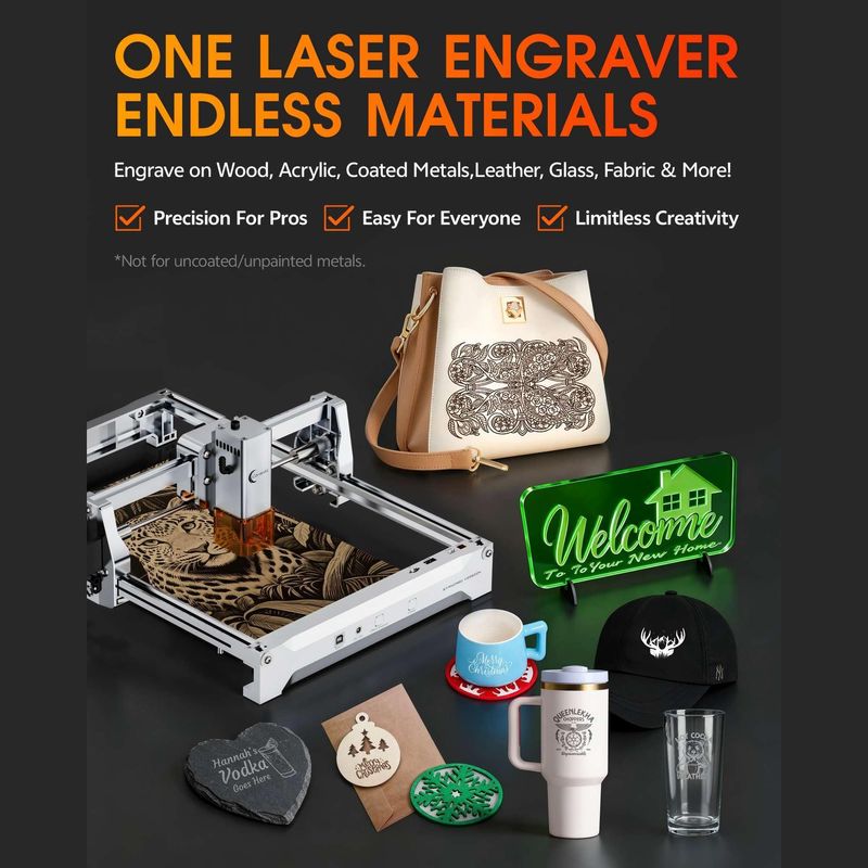 Workable on more than 120 materials like wood, bamboo, slate stone, kraft paper, acrylic, glasses, coated metal, etc.