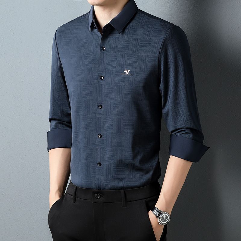 Casual Long Sleeve Lapel Seamless Adhesive Shirt Navy Blue 4XL