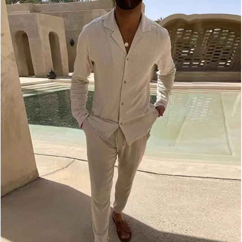 Casual Long-sleeved Suits Fashion Lapel Single-breasted Shirt Top And Slim-fit Trousers Men Clothing Beige Pants XXXL