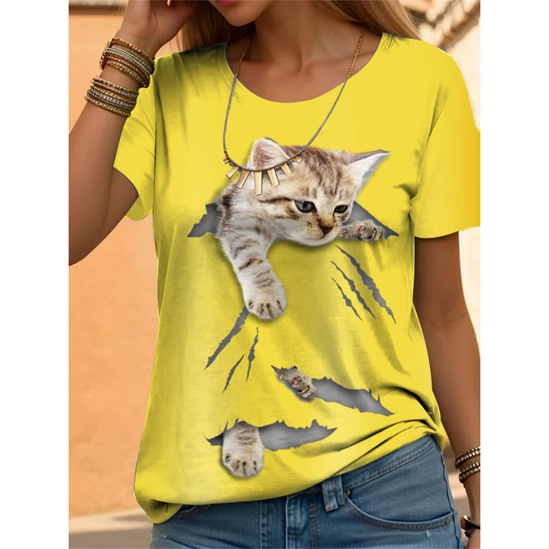 Casual Loose Cat Printing Short-sleeved Shirt Yellow M