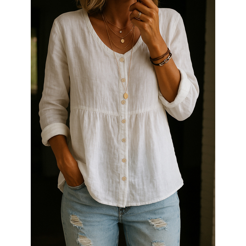 Casual Loose Fashion Cotton And Linen Long Sleeve V-neck Buttons Shirt White 2XL