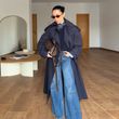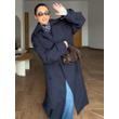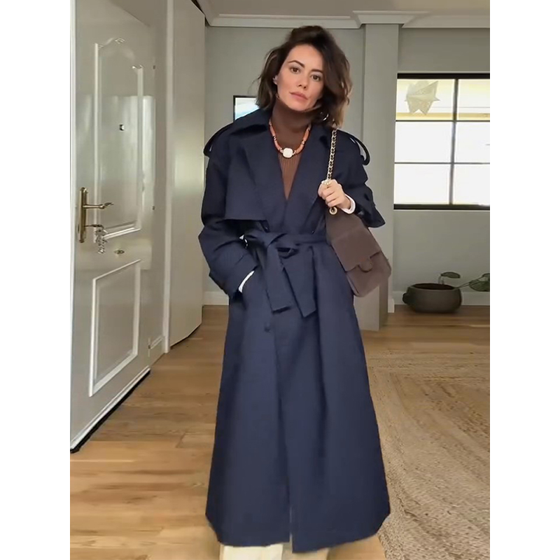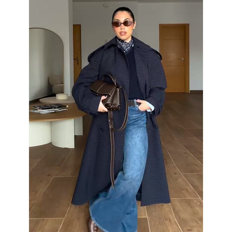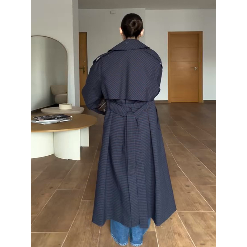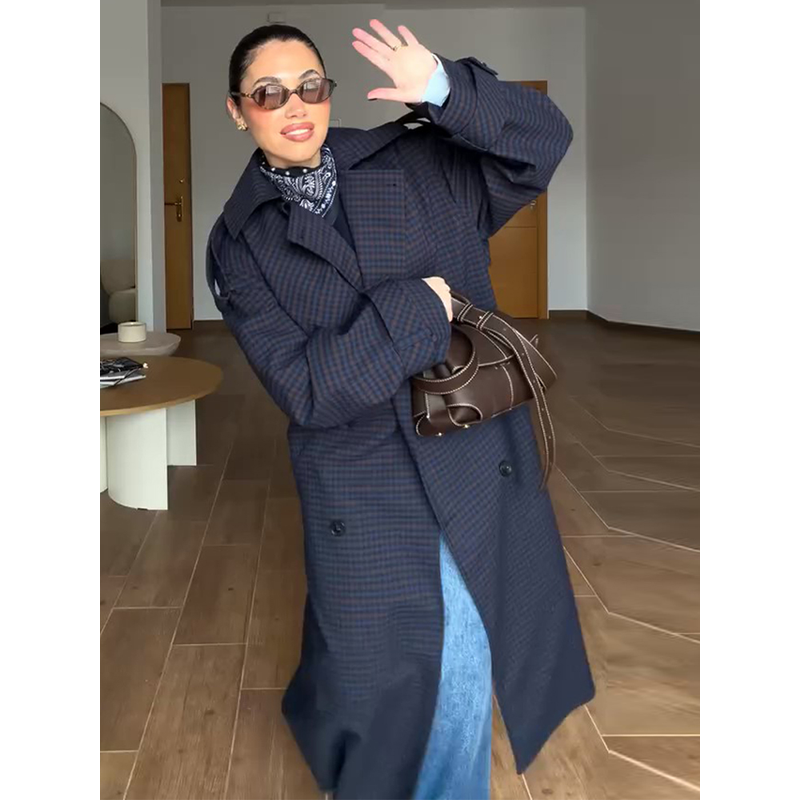 Casual Loose Long Plaid Coat Women Chic Full Sleeve Double Breasted Belt Lapel Coat Female 2026 Spring Street Outwear Lady
