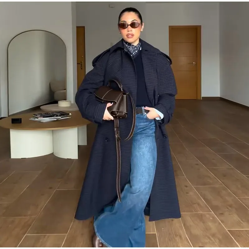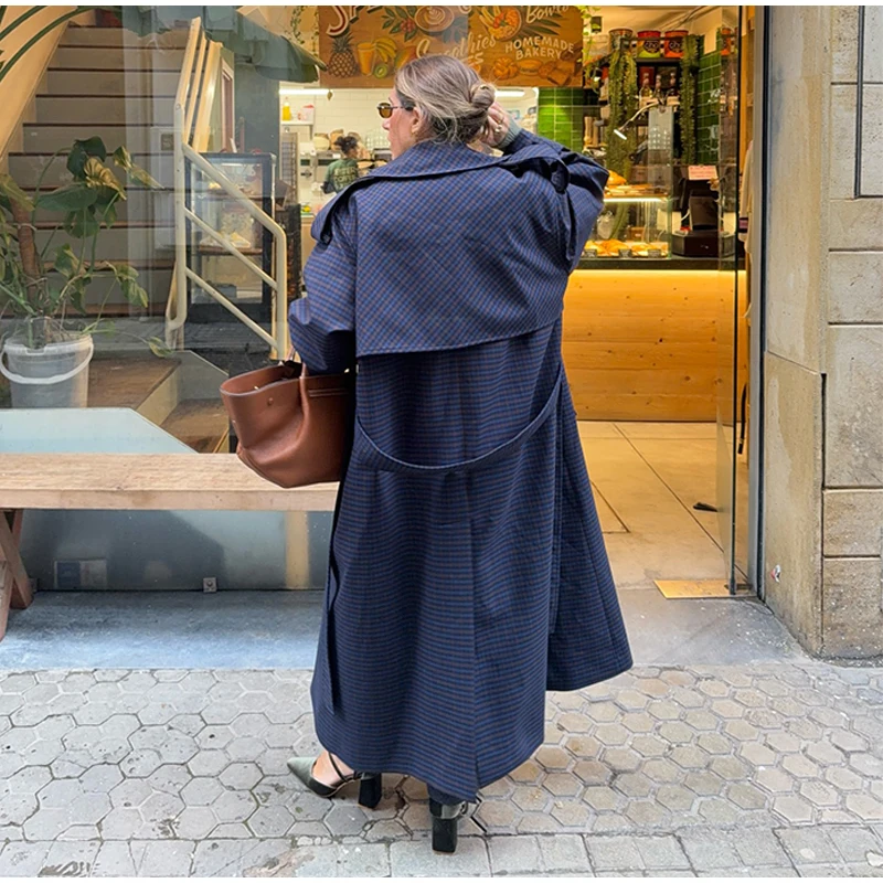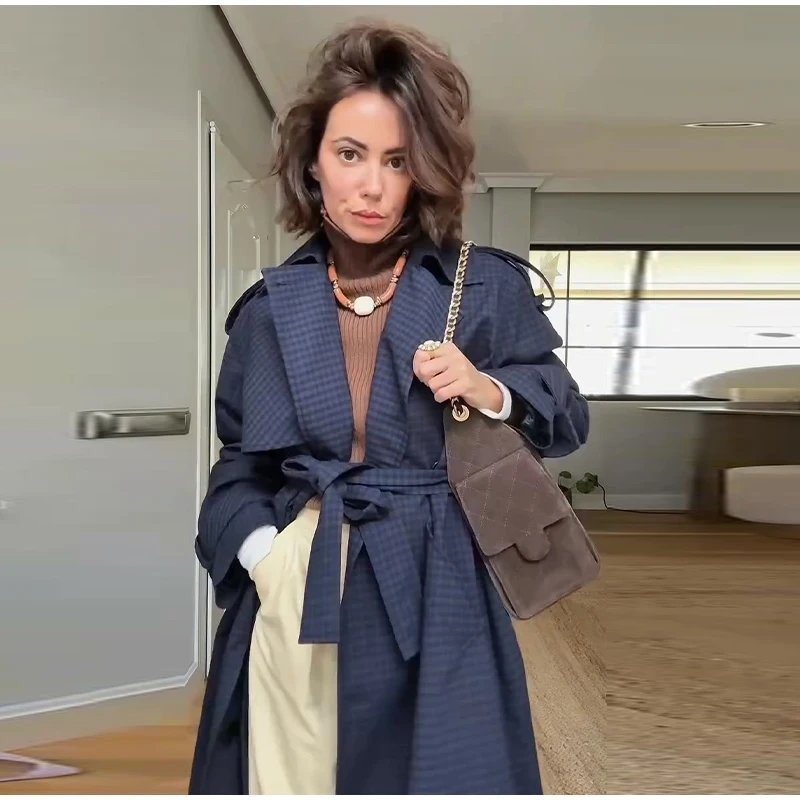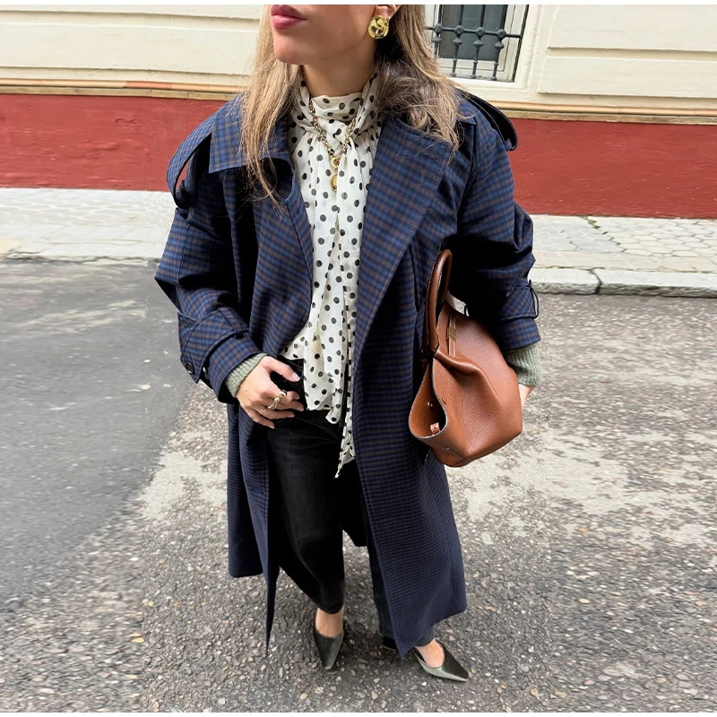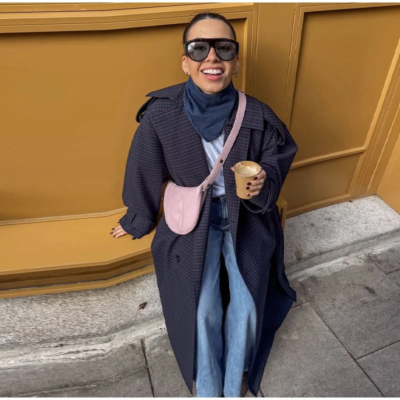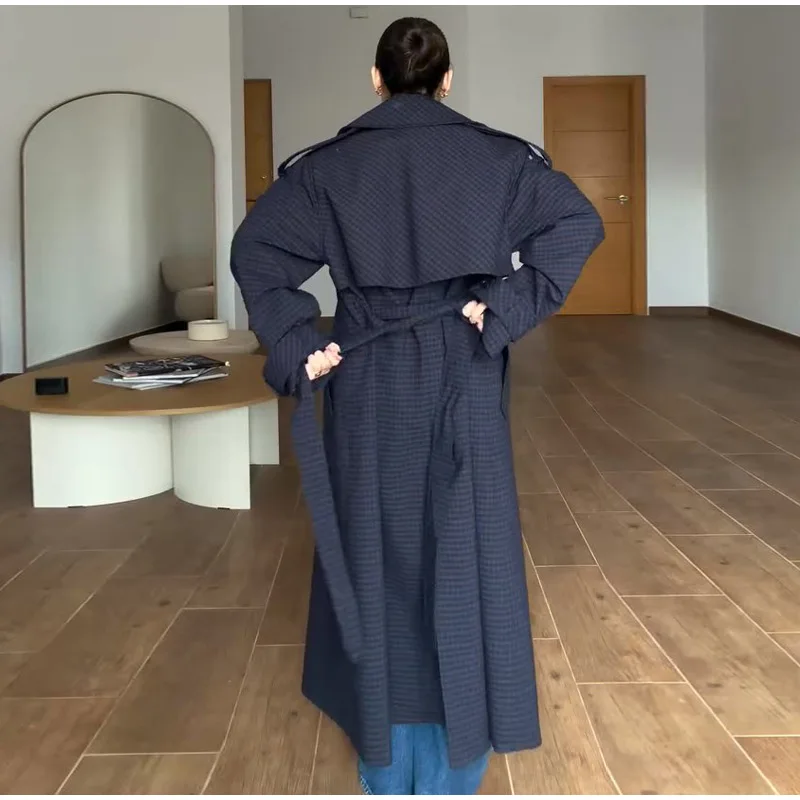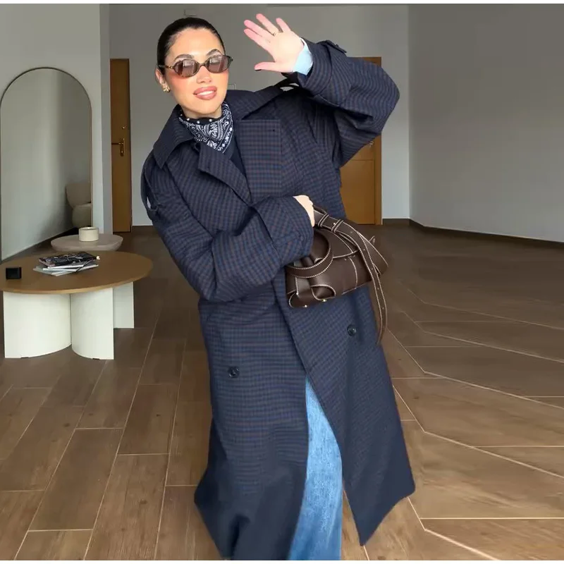 Casual Loose Long Plaid Coat Women Chic Full Sleeve Double Breasted Belt Lapel Coat Female 2026 Spring Street Outwear Lady