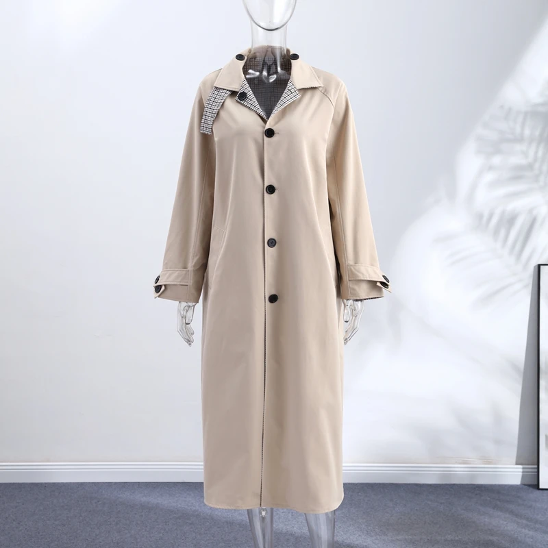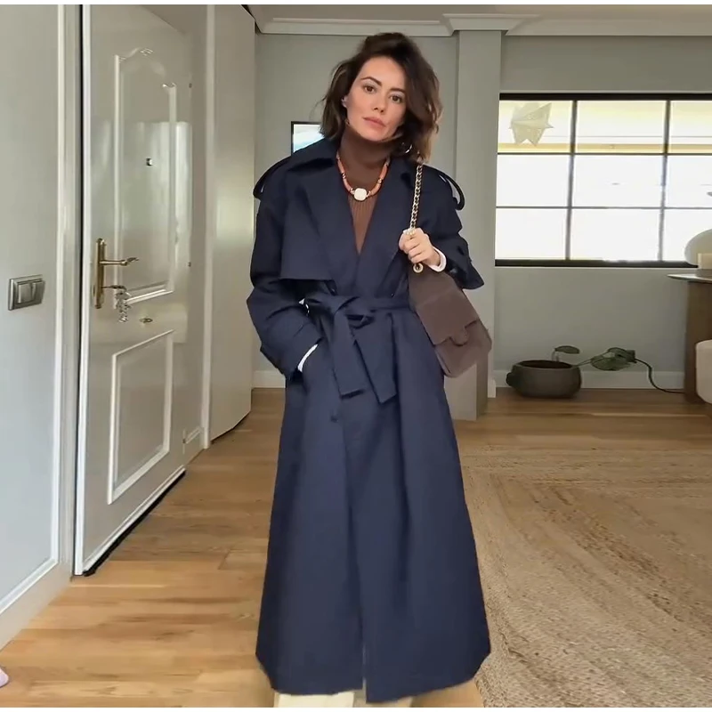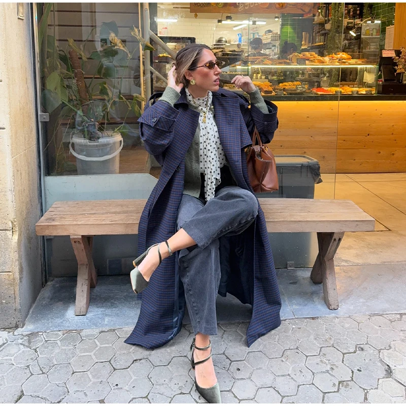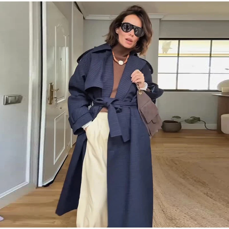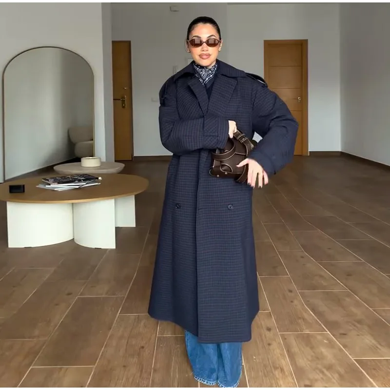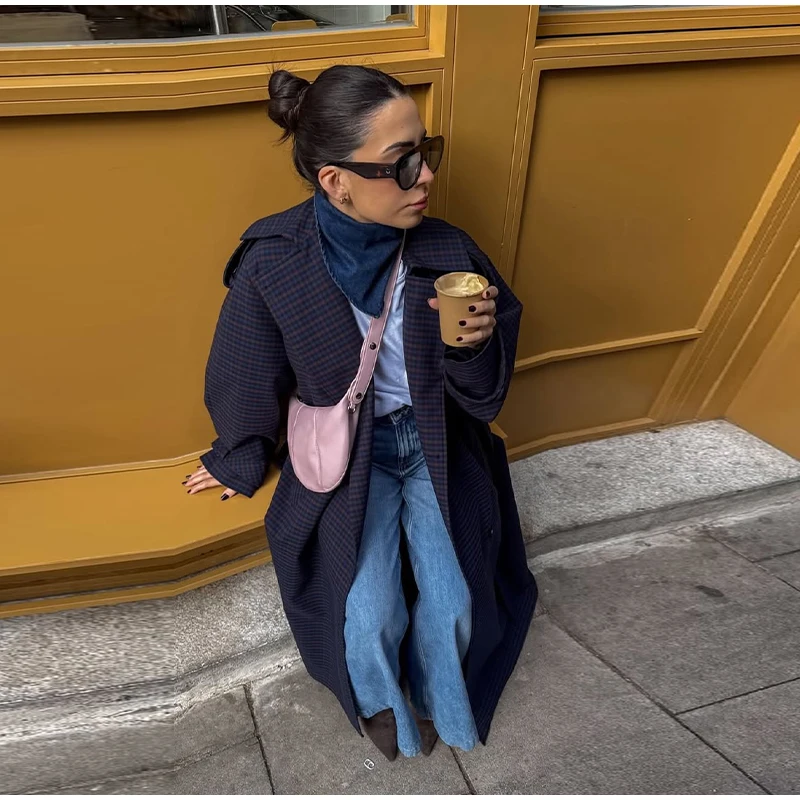 Casual Loose Long Plaid Coat Women Chic Full Sleeve Double Breasted Belt Lapel Coat Female 2026 Spring Street Outwear Lady