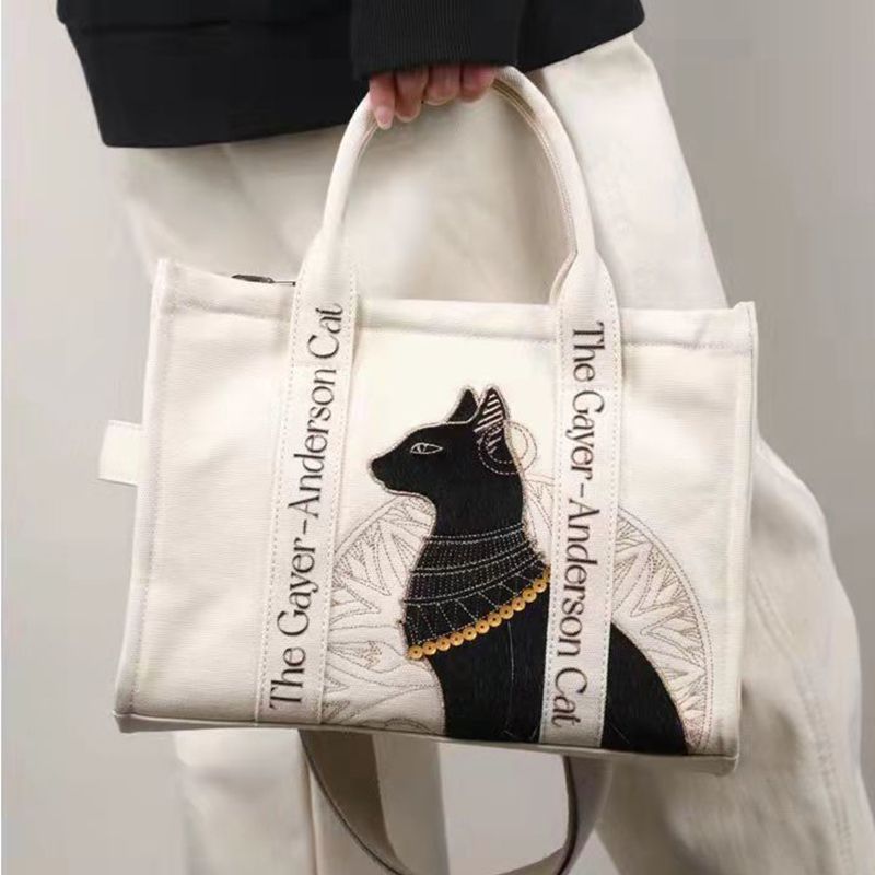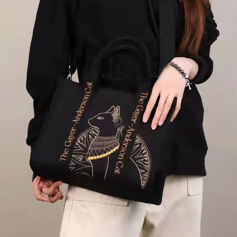 Cat Embroidered Canvas Shoulder Bag Letter Print Handbags Leisure Daily Students Preppy Style Messenger Crossbody Bags Black