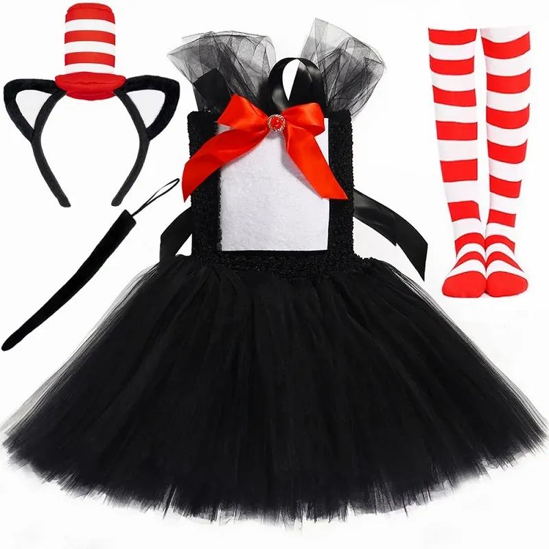 Dr. Seuss Cat in The Hat Tutu Dress Costume for Girls Halloween Carnival Party Fancy Clothes Outfit Kids Black Cat Tulle Dresses