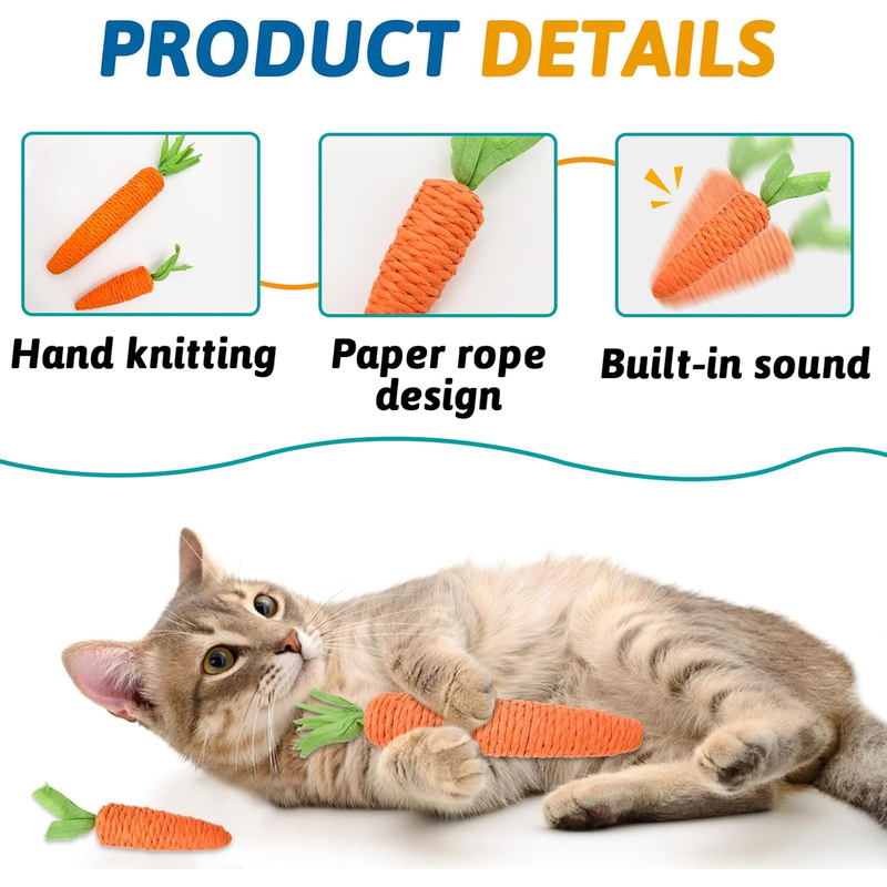 【Paper Rope Design—High-quality and Long-lasting】The carrot cat toys are wrapped with paper ropes and all woven by hand. These high-quality toys are difficult to be damaged by cats and they can be long-lasting toys for cats.