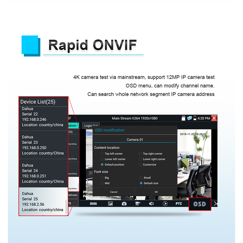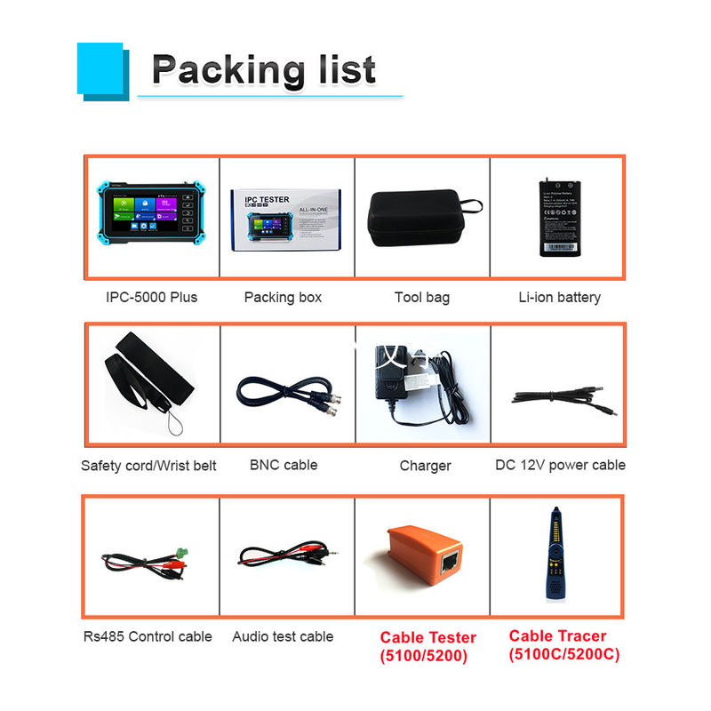The 5. inch IPS touch screen IP camera tester is designed for maintenance and installation of IP analog, HD coaxial cameras as well as other security equipment. The 1920*1080 resolution enables it to display network HD cameras and analog cameras in high resolution. The unit supports many ONVIF PTZ and analog PTZ control, and cable test functions. CCTV installers often need to carry a variety of testing tools to complete their work. If take the all in one camera tester, making working conditions safer and increasing productivity.