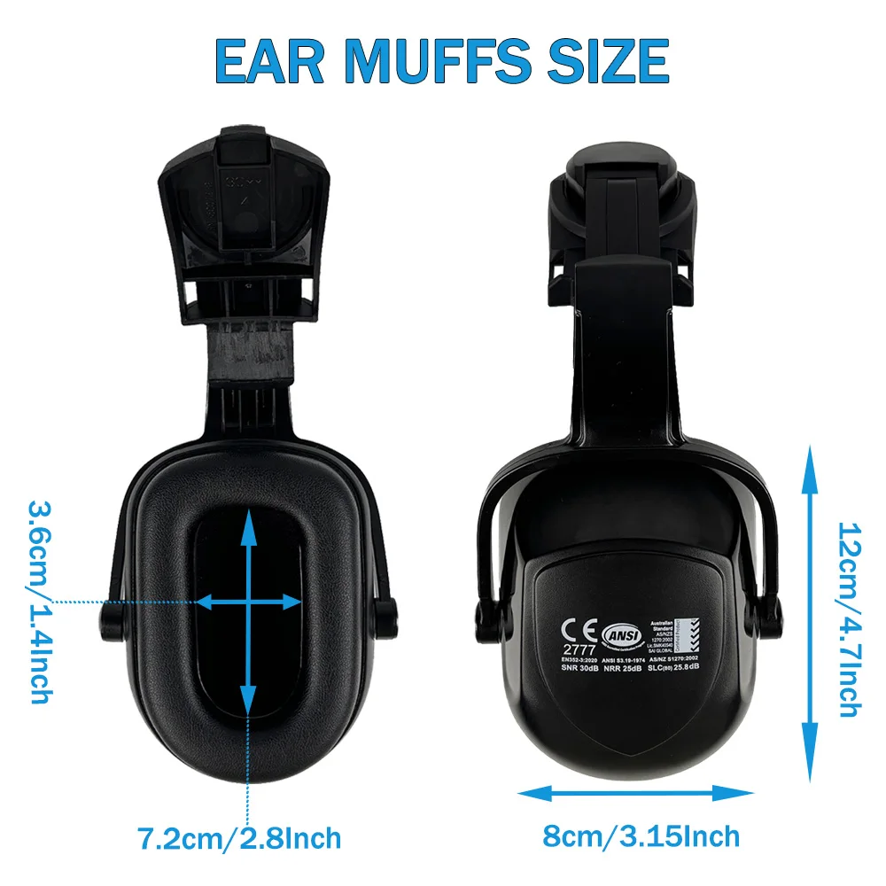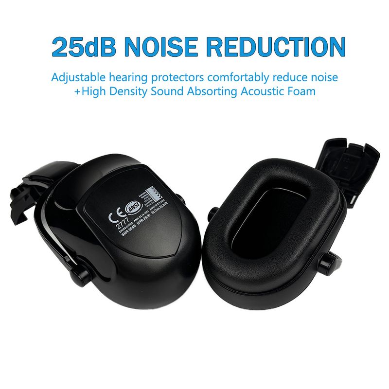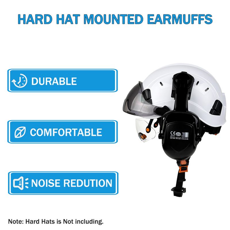 SNR 30dB NRR 25dB Noise Reduction Rating:Our hard hat attachment earmuff offers a SNR 30dB NRR 25dB (Noise Reduction Rating) for our hearing protection.Providing existing protective gear with a superior level of hearing protection,earcups lift up when sound levels are safe, tested and compliant with ANSI NRR:25dB. CE at SNR:30dB, AUS/NZS: Class 5 . Ideal for protection against noise arising from a wide range of applications in the workplace