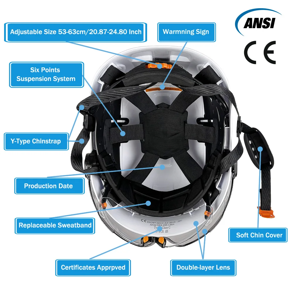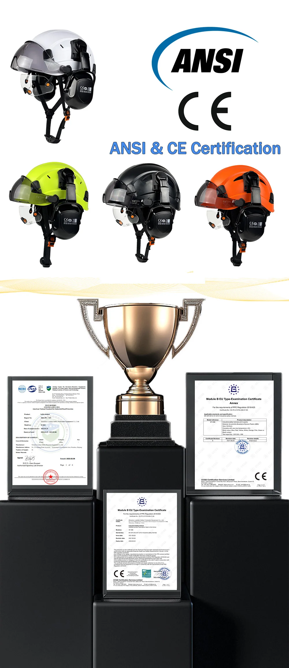 【Certificates Approved】: Our Work Hard Hat meet ANSI Z89.1-2014 ,Type 1 Class C Standards, Also meet CE EN397-2012 ,-20℃.The visors with CE EN166 & ANSI Z87.1 Approved. Can be used in Construction, Industrial , Decoration, Outdoor Work ,Rescue ,Electricity, Mining and other places To get Head Protection, Improve the work safety Level and workers Get Happy daily working time. The Ear Protector Meet EN 352-3,ANSI S3.19-1974