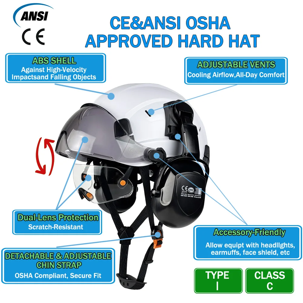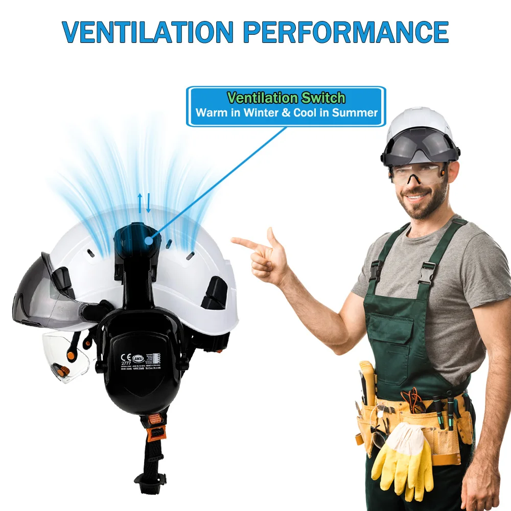 CE Safety Helmet w/ Built In Goggles Earmuffs Hard Hat w/ Visor Vented Industrial Hardhats Construction Work Head Protection