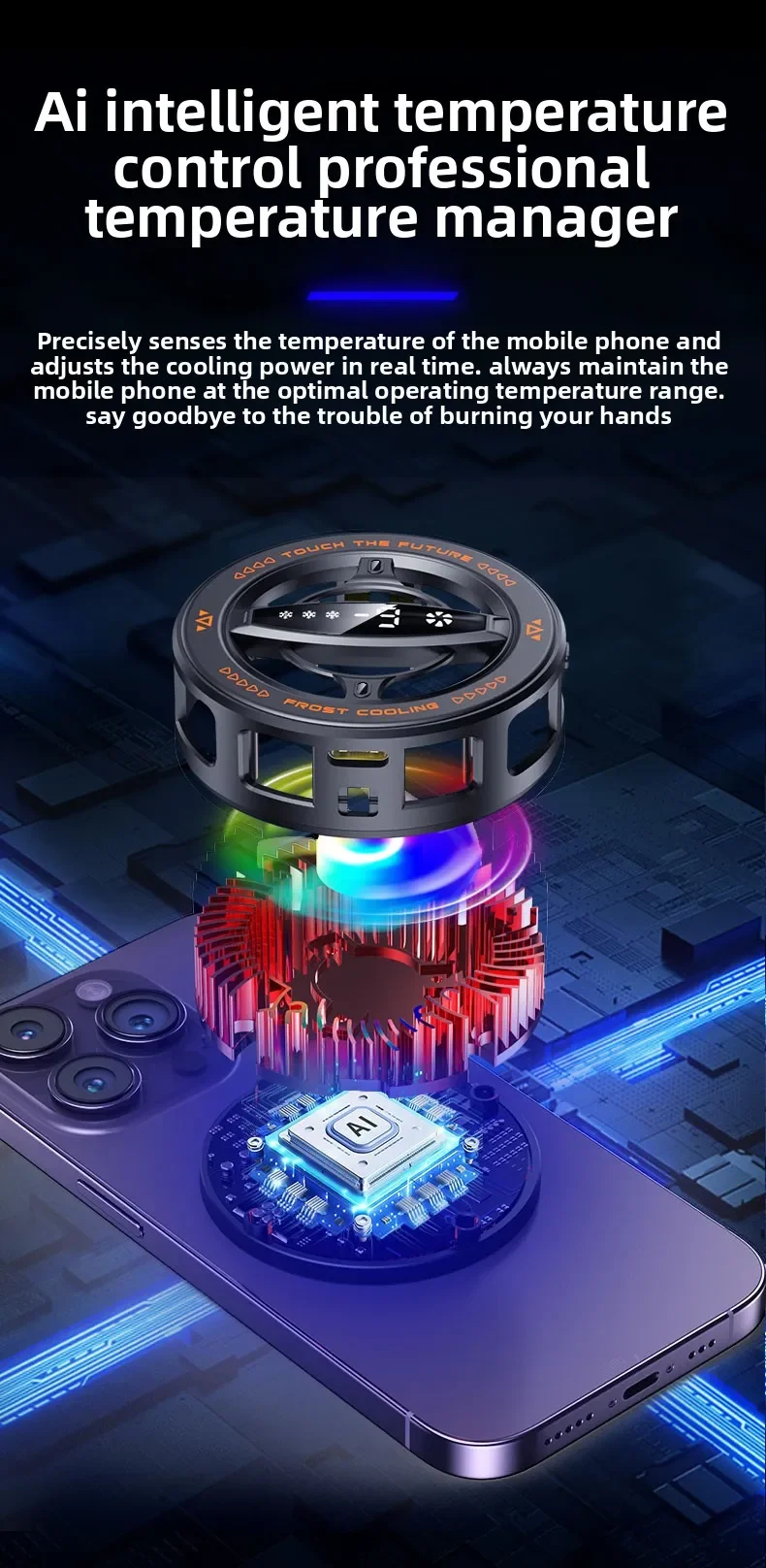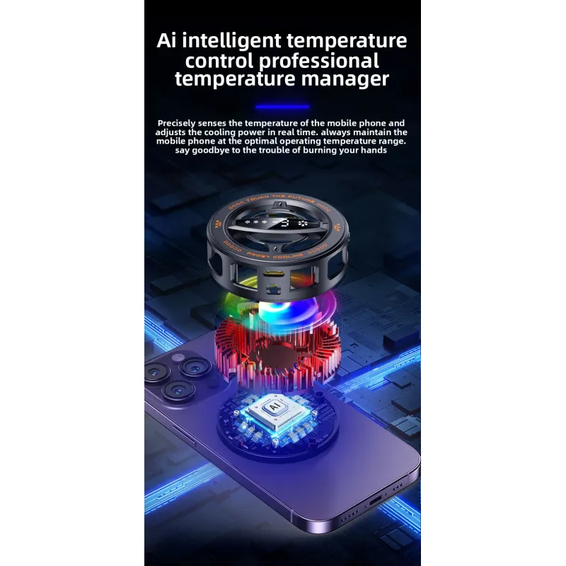 Cell Phone Cooler, Cooling Fan with AI Smart Temperature Control, 3 Levels Adjustable Radiator, Compatible with iOS & Android