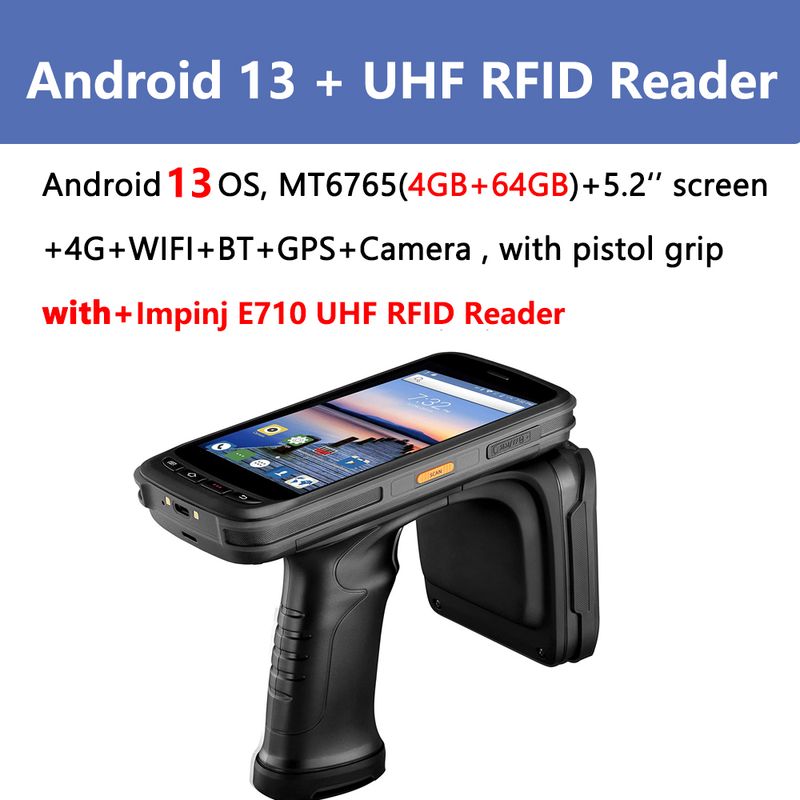 Android 11/13 MT6765 Cortex-A53 Qcta-core 2.5GHz + 5.2'' Screen + 4G RAM+64GROM + Wifi + BT4.0 + 13MP Camera + GPS + 4G + NFC + SDK+Pistol Grip+Impinj E710 UHF RFID Reader