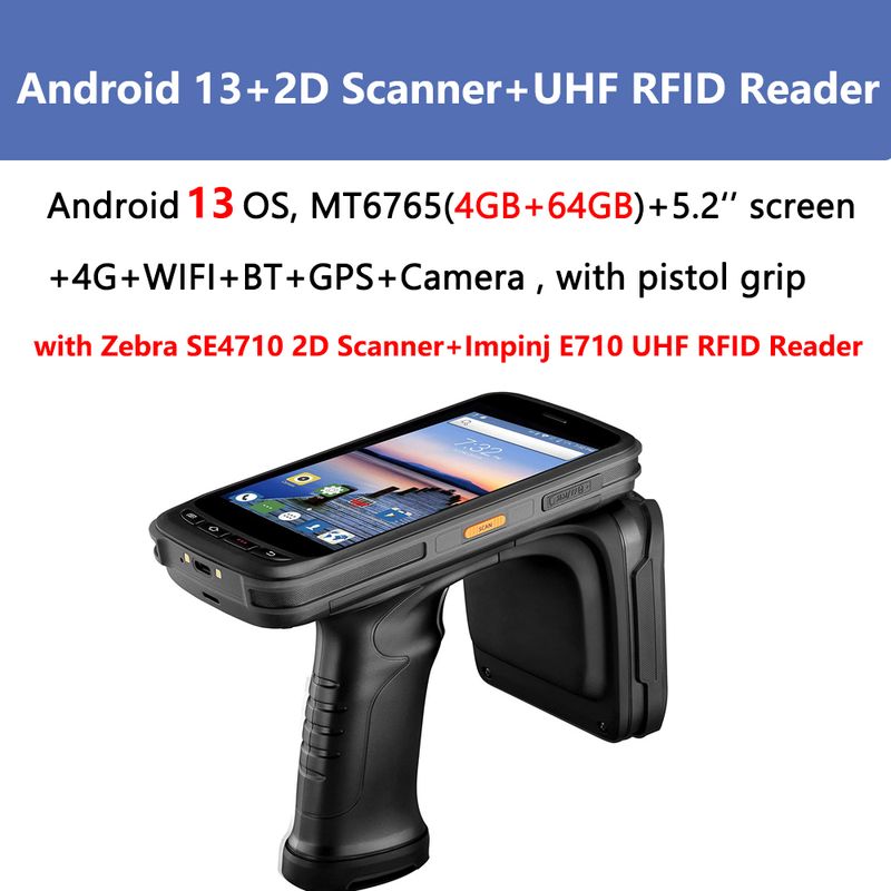 Android 11/13 MT6765 Cortex-A53 Qcta-core 2.5GHz + 5.2'' Screen + 4G RAM+64GROM + Wifi + BT4.0 + 13MP Camera + GPS + 4G + NFC + SDK+Pistol Grip+Zebra SE4710 2D Scanner+Impinj E710 UHF RFID Reader