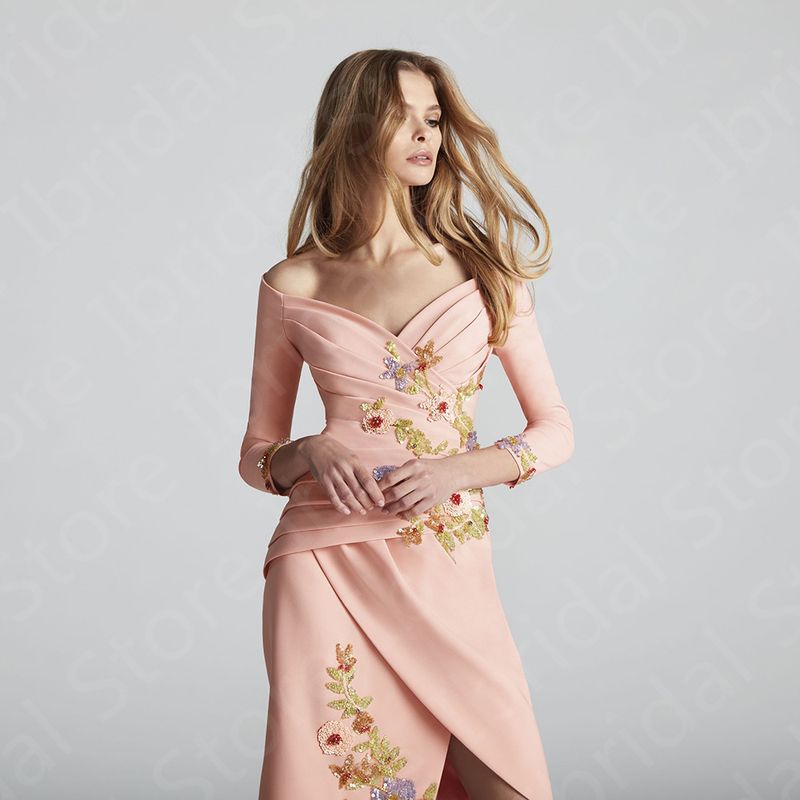 Charming Pink Short Mother of the Bride Dresses Off Shoulder 3/4 Sleeves Mid Calf Wedding Party Gowns 2023 Latest