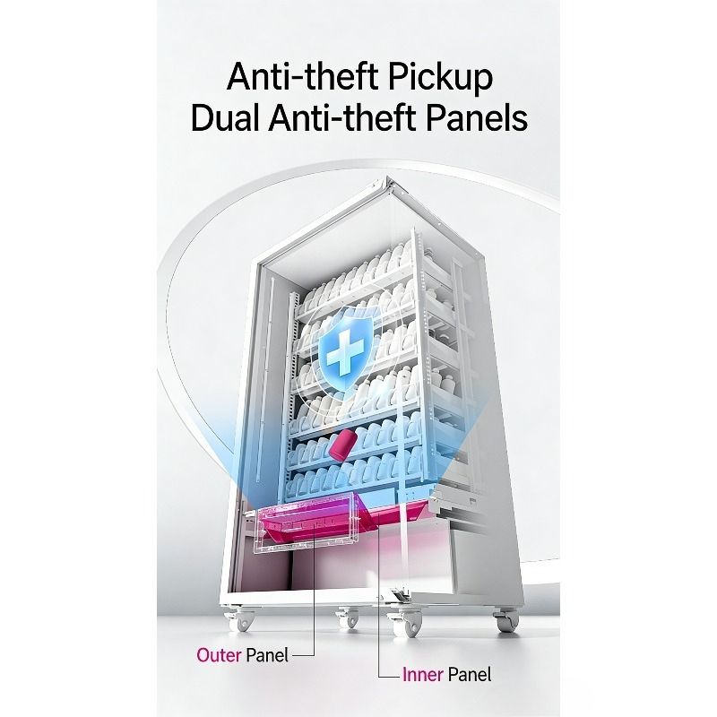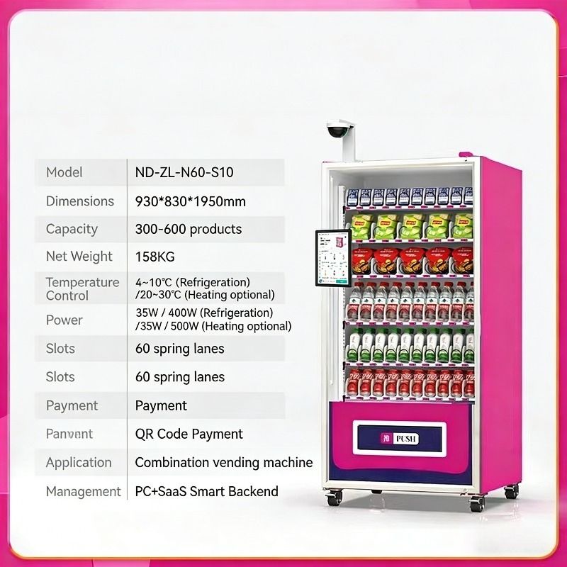 This 60-slot refrigerated spring vending machine is designed for high-capacity, 24/7 unattended retail. With a capacity of 300–600 items and a temperature range of 4–10°C, it is ideal for selling chilled beverages and snacks. The machine features a robust all-metal construction with an integrated thickened foam layer for energy-efficient insulation, double tempered glass with electric heating defogging, and a dual anti-theft pickup port. It supports QR code payment and remote temperature control via a PC+SaaS smart backend, enabling intelligent operation and real-time monitoring.