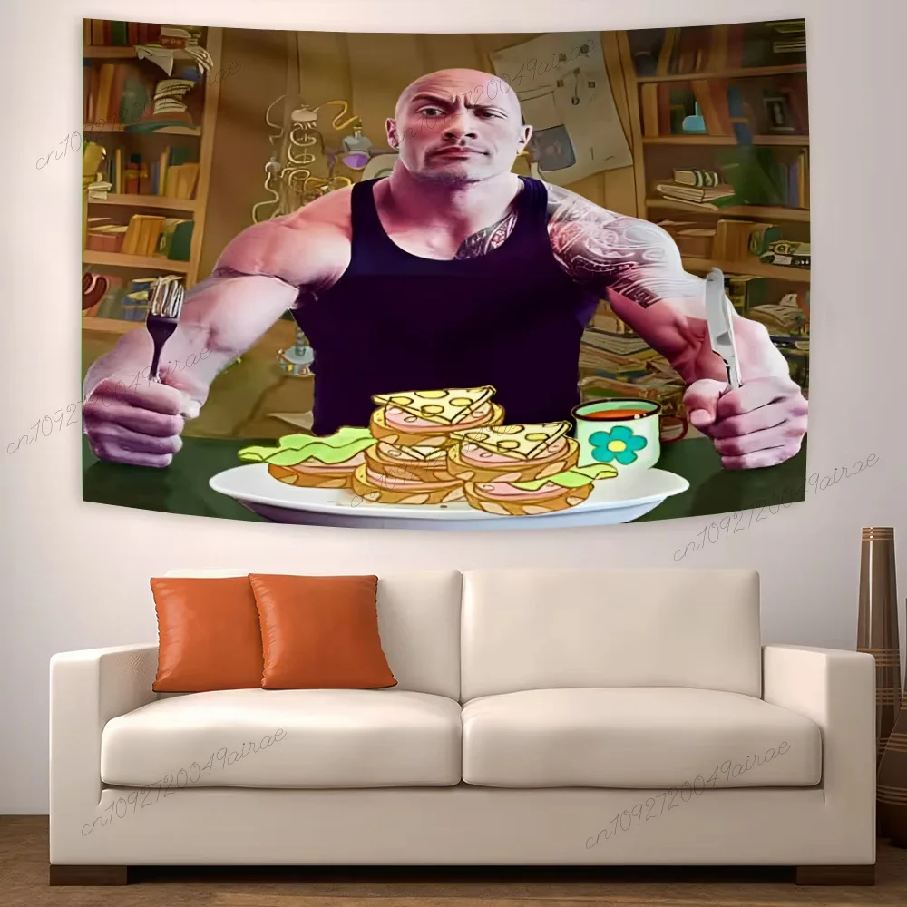 Cheat Day The Rock Eating Pancakes Wall Hanging Tapestry Flags Funny Meme Tapestry Aesthetic Dorm Banner Teen Room Decoration