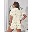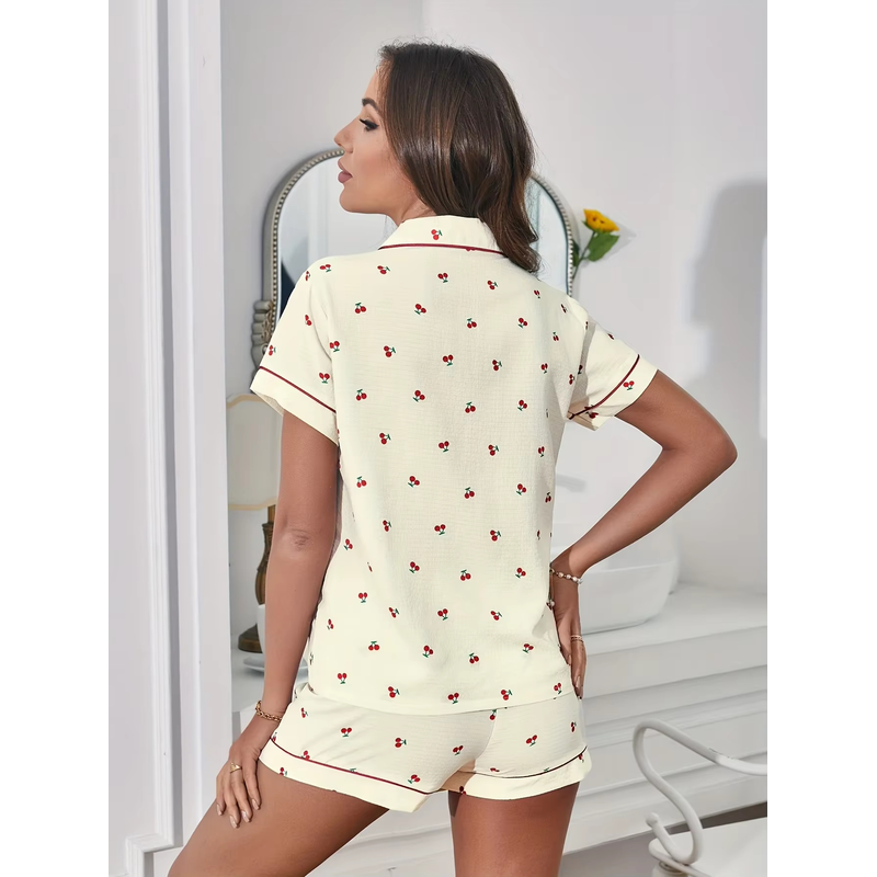 Cherry Print Textured Pajama Set Cute Short Sleeve Buttons Lapel Top & Elastic Shorts Women's Sleepwear