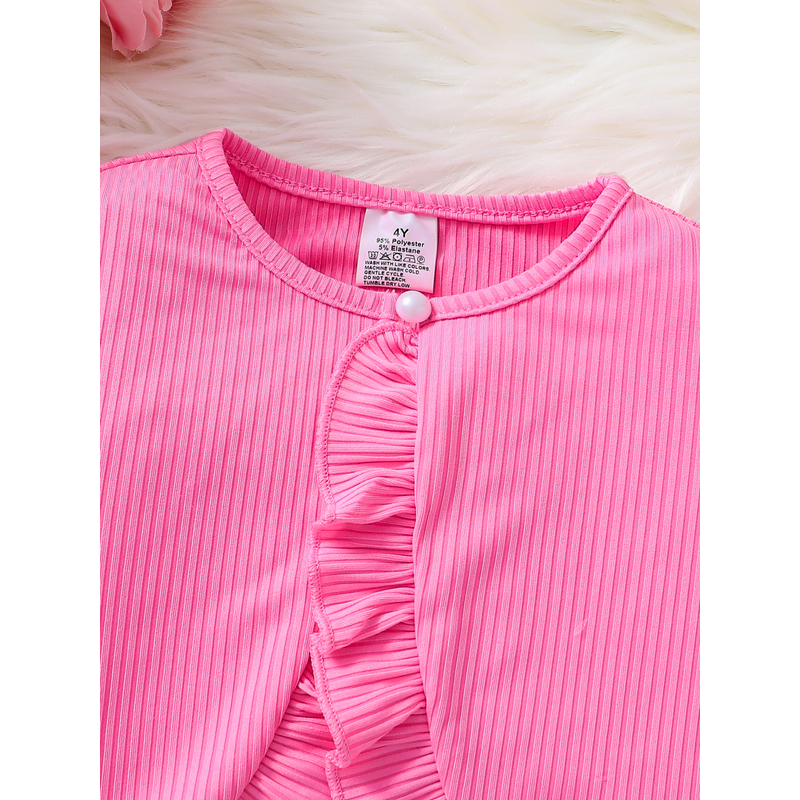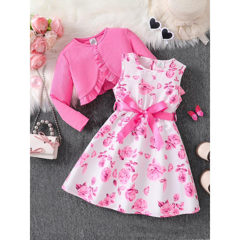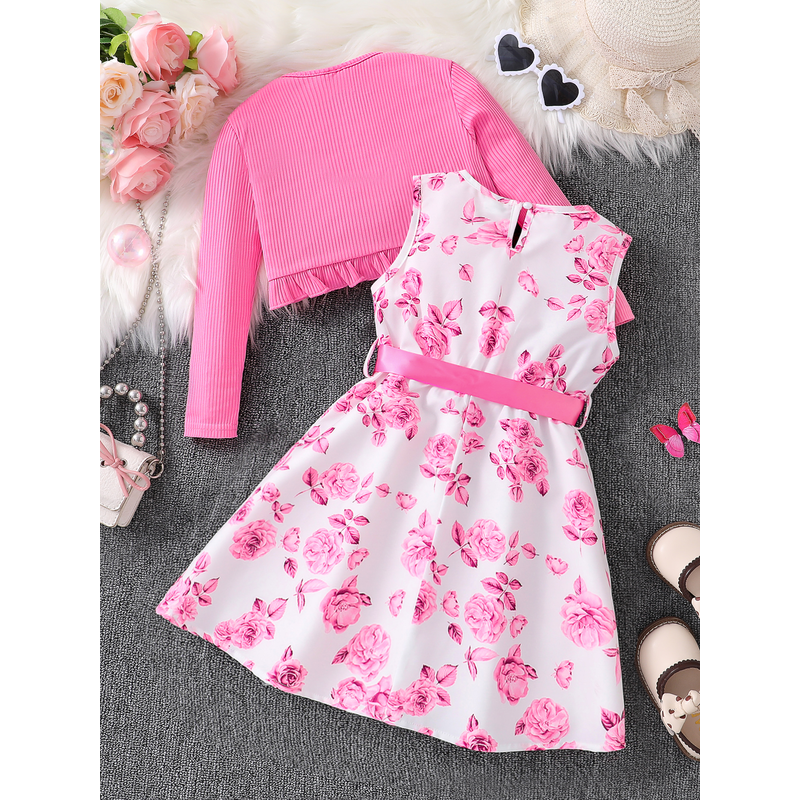 Children's clothing girl autumn fashion casual pink floral dress set 2-piece set - pink round neck vest+pink floral skirt