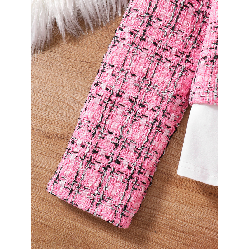 Children's spring and autumn new cute girl fashion dress 3 sets of pink plaid top + skirt + white long-sleeved base shirt
