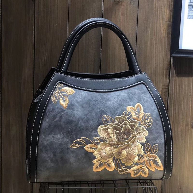 Chinese Style Embroidery Luxury Handbag Pu Leather Large Capacity Shoulder Bags Dark Grey