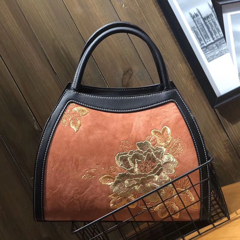 Chinese Style Embroidery Luxury Handbag Pu Leather Large Capacity Shoulder Bags Orange