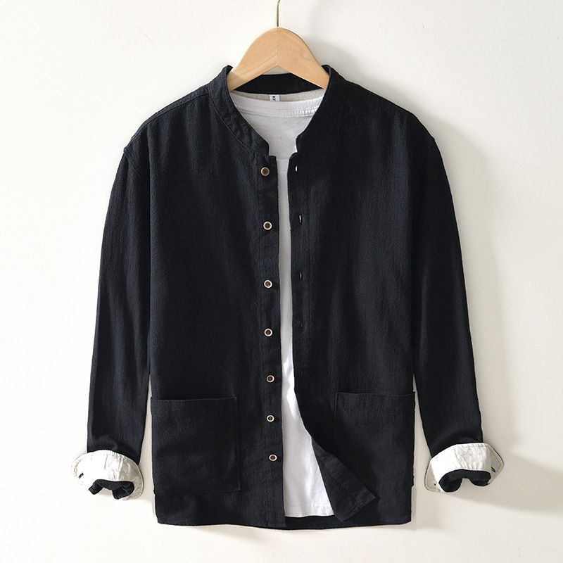Chinese-style Stand Collar Ramie Long-sleeved Shirt Breathable Linen Casual Chinese-style Shirt For Men Black XL