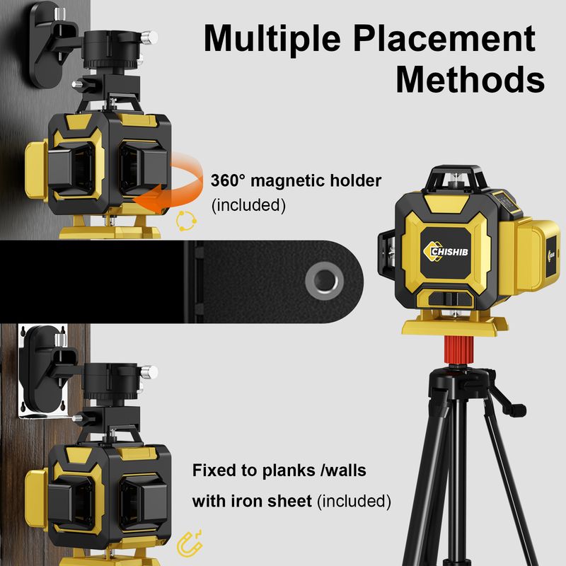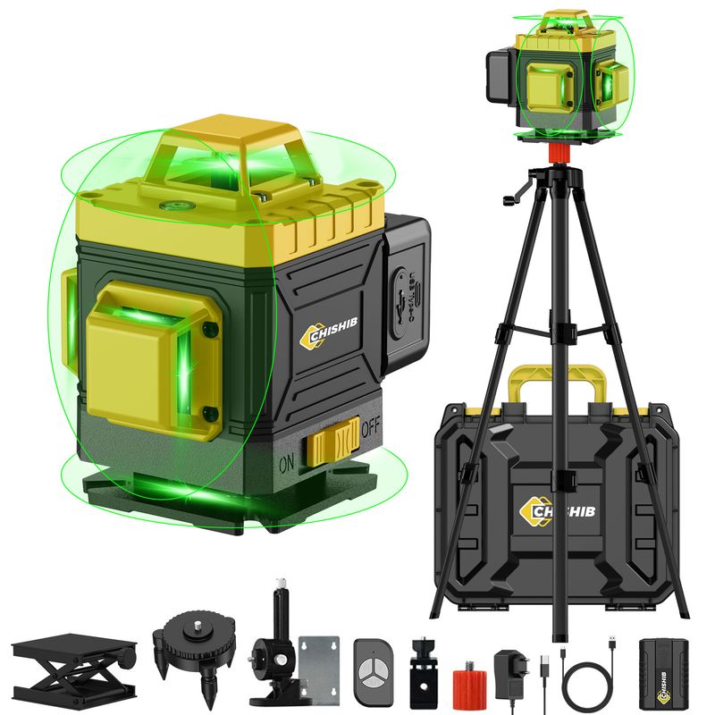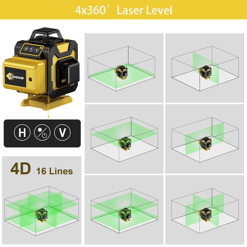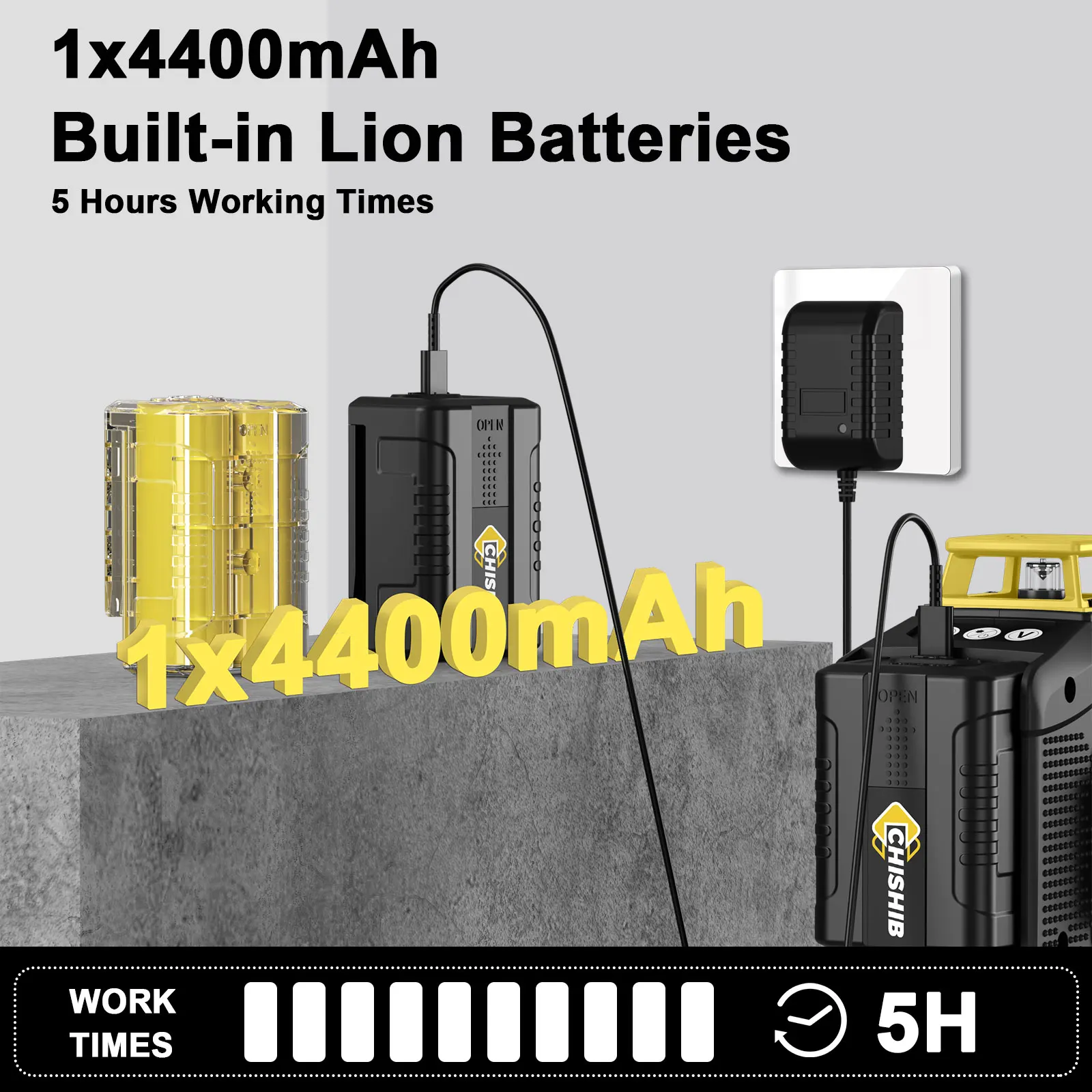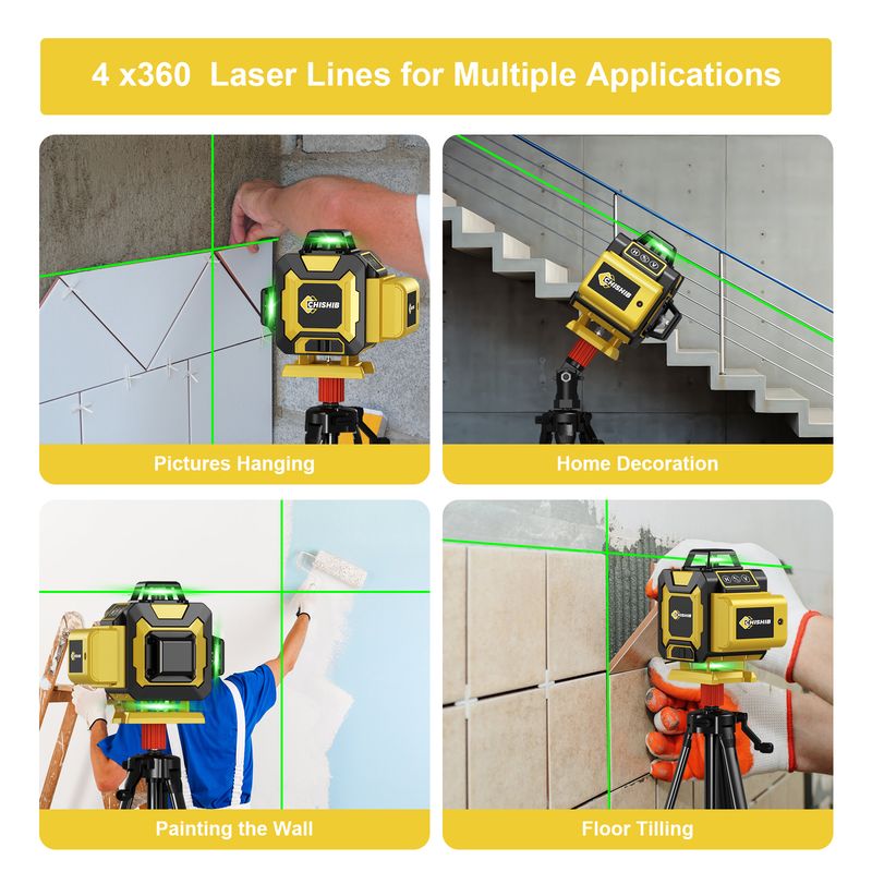 With 4400mah rechargeable batteries lasting 5 hours, to accompany you throughout your project work, the CHISHIB 360 laser level is ideal for completing diverse renovation projects. Its full-featured remote control enables operation of 16 green laser lines from any room location, including pulse, self-leveling, and manual modes. Whether you're a professional contractor or a DIY enthusiast, this laser level is designed to help you tackle projects of any size.