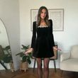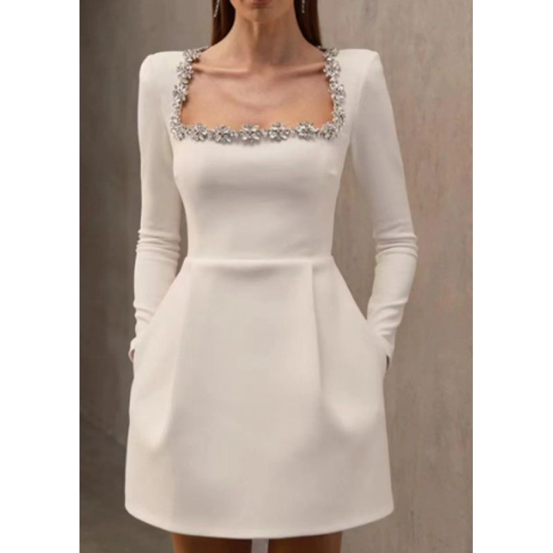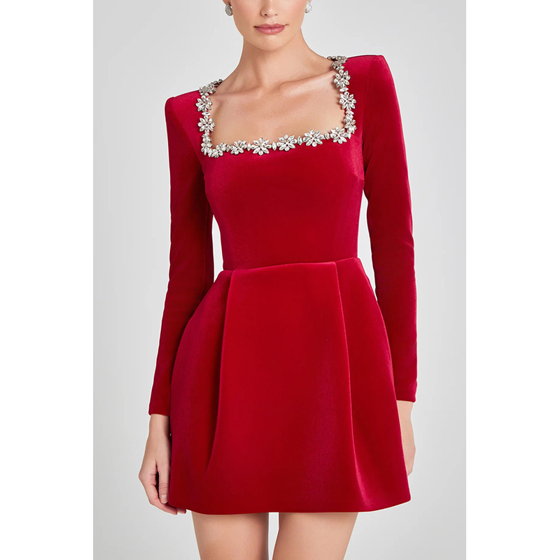 Christmas Elegant Square Neck Long-sleeved Dress With Flowers Rhinestone Design Fashion A-line Short Dresses Spring Clothing For Women Red L