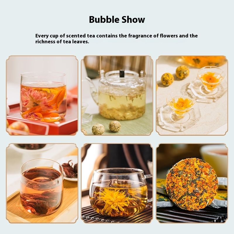 Raw materials and ingredients: Yunnan big leaf tea, chrysanthemum, Jasmine Flower, Danfeng peony, glutinous rice Myrcia, lotus leaf, double red rose, Lanzhou lily