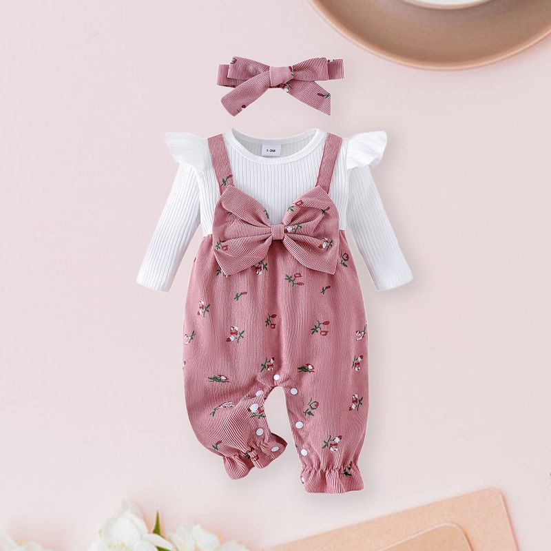 Toddler long sleeve romper, corduroy fabric, floral print, fake two pieces patchwork, cute bow, ruffles, long sleeves, round neckline, crotch buttons; And cute headband set, simple but fashionable, make your baby more adorable