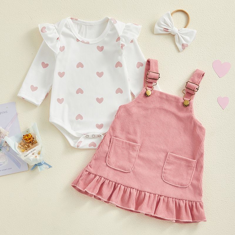 Baby Girls 3Pcs Spring Outfits Heart Print Romper + Suspender Skirt + Headband Set Newborn Clothes