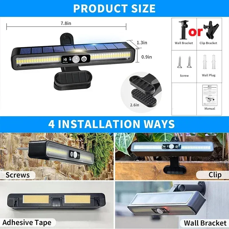 【Super Brightness】– With big and advanced 36 LEDs, this clip on solar motion sensor lights outdoor can illuminate a wide area of up to 50 square feet while providing 400 lumens of bright light. Recommend height: 4.92ft - 8.2ft.