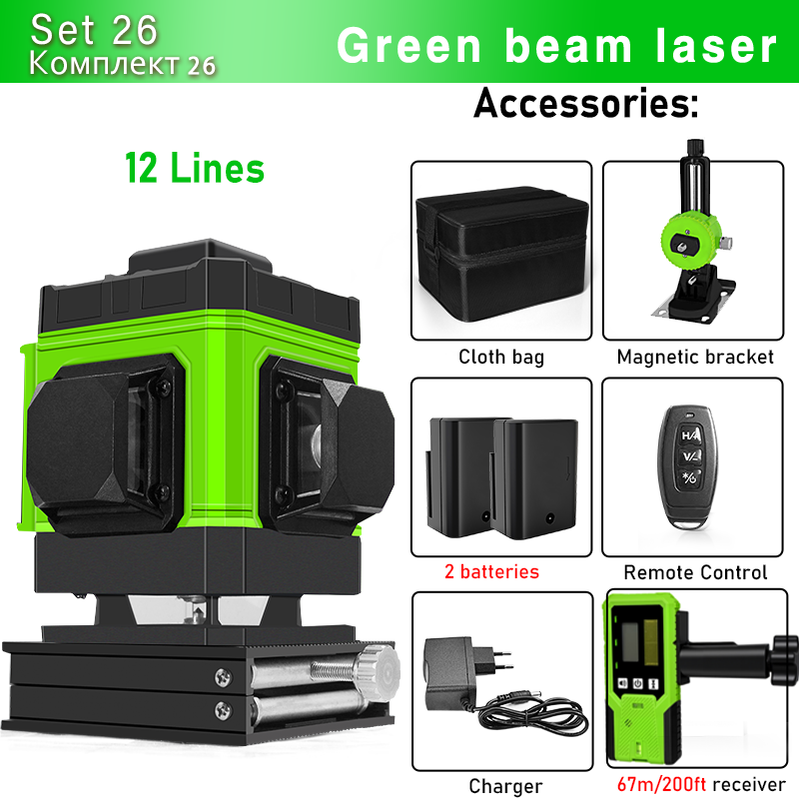 Clubiona 16/12 lines Laser Level professional Super powerful Green Lines With 3600mAh Li-ion Battery Remote Control pulse mode