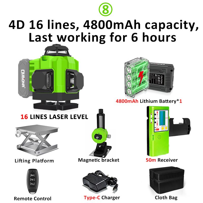 Clubiona 3D/4D 12/16 Lines laser level professional super powerful green line and lithium-ion battery remote control pulse mode