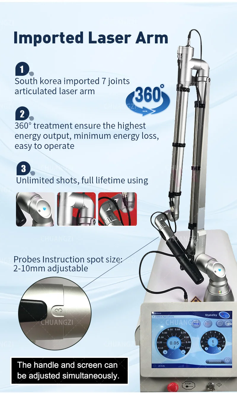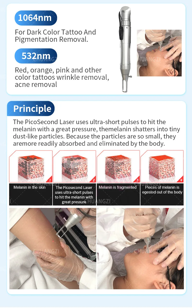 The Picosecond Laser uses ultra-short pulses to hit the melanin with a great pressure, the melanin shatters into tiny dust-like particles. Because the particles are so small, they are more readily absorbed and egested out of the body.