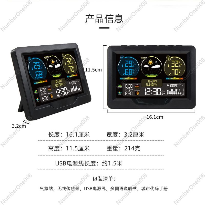 (6) Regular packing list: 1* weather clock, 1* USB power cable, 1* outdoor transmitter, 1* Chinese instruction manual (English, German, French, Spanish and Italian)