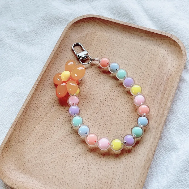 Colored bead petal Lanyard for IPhone Anti-Lost Bracelet for Samsung Mobile Phone Case Wrist Strap Car Keychain Cute Phone Charm