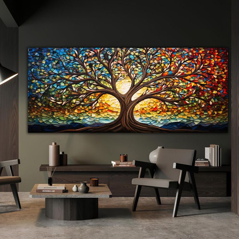 Colorful Mosaic Glass Canvas Painting,Tree of Life Artwork Canvas Print, Mythology Gift, for Living Room Office Home Decoration