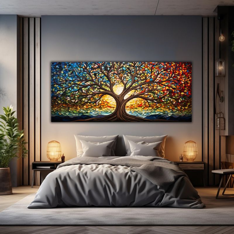Colorful Mosaic Glass Canvas Painting,Tree of Life Artwork Canvas Print, Mythology Gift, for Living Room Office Home Decoration