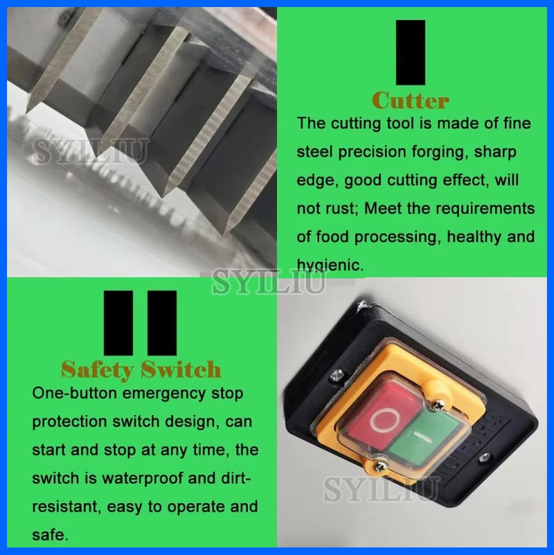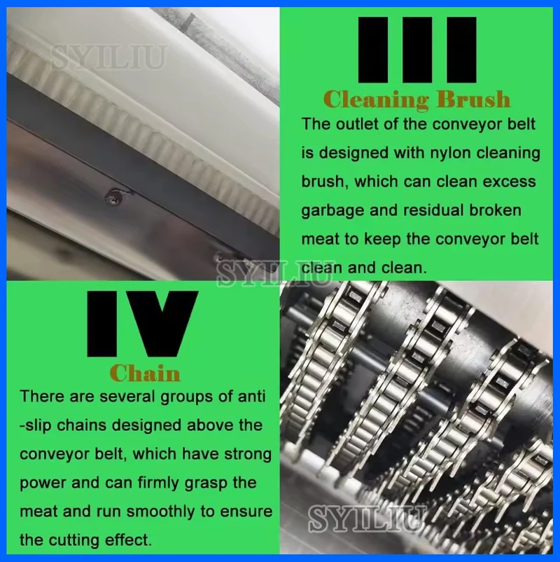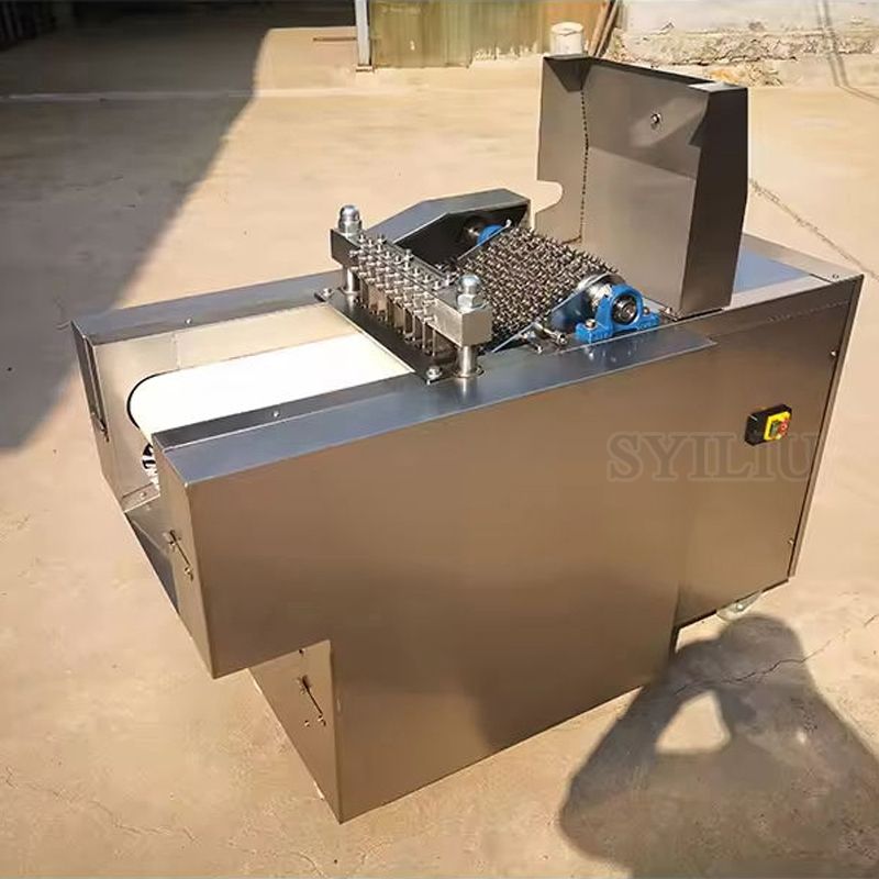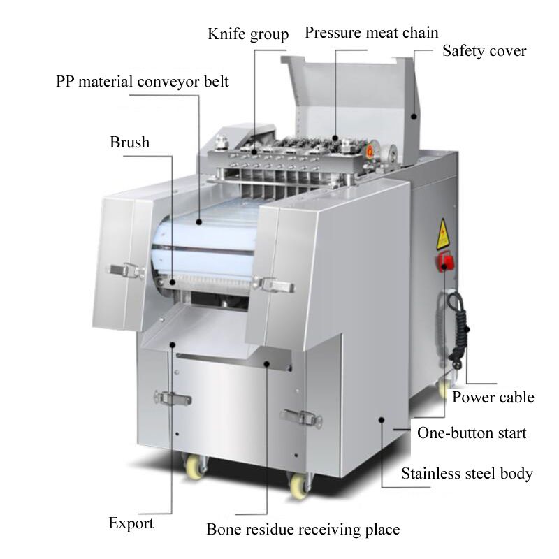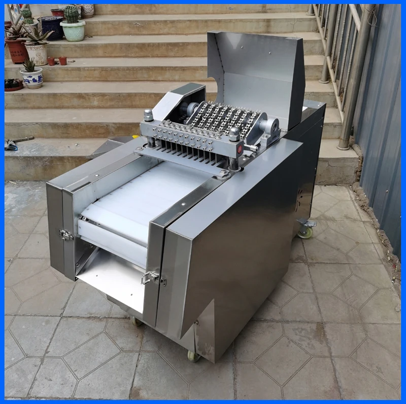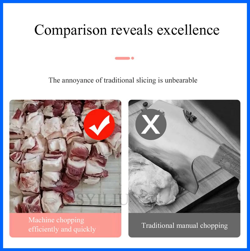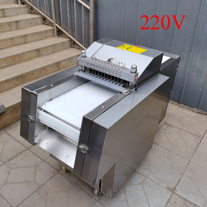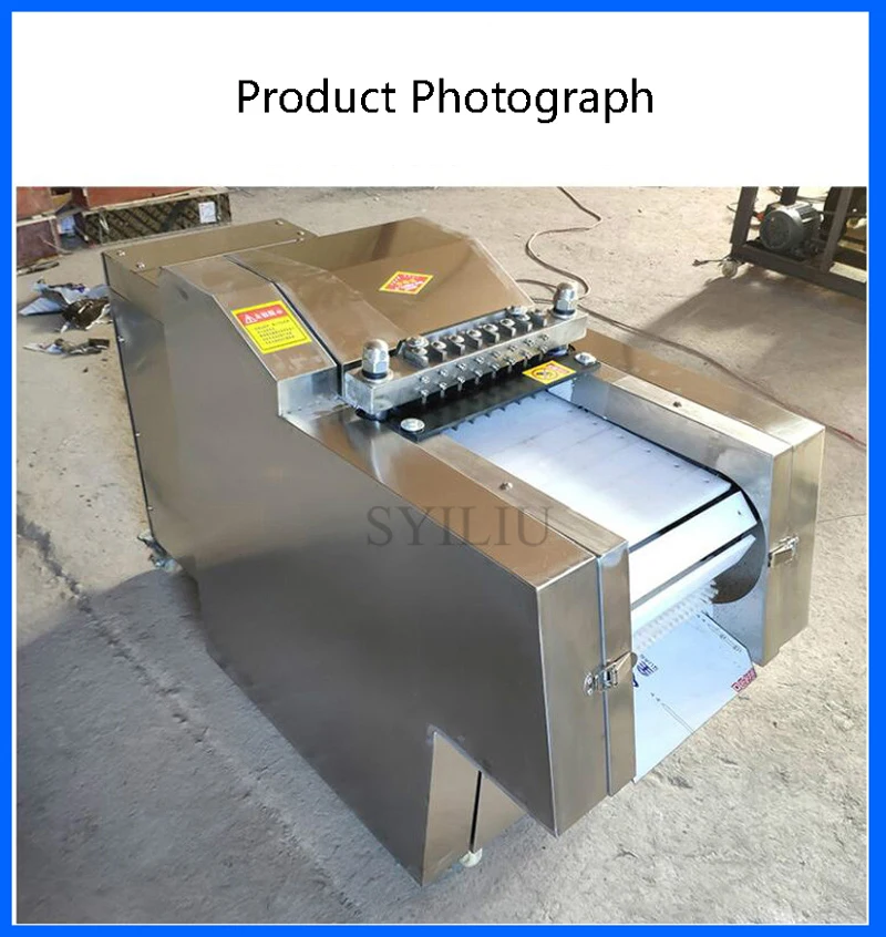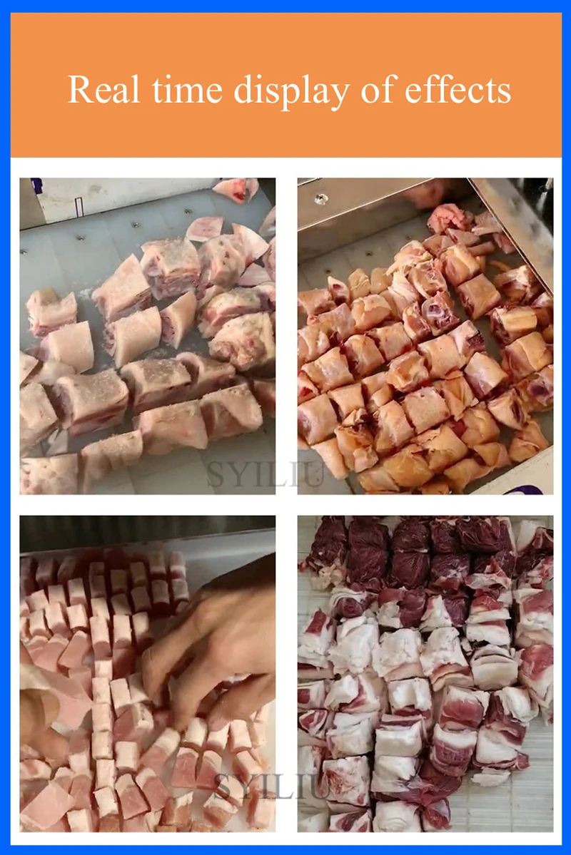 High performance/price ratio, and the machine, no loss, the use of special tool cutting, automatic feed (conveyor belt is made of special material for half a year), to avoid the risk of cutting, using the security is higher, in the process of cutting off does not produce waste, protect the interests of you. Save manpower, and one machine can work for many people, can cut 500kg/H, greatly improve production efficiency. Widely used in large middle and small food processing plants, collective canteens, slaughterhouses, meat processing factory, supermarket, etc