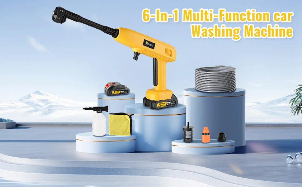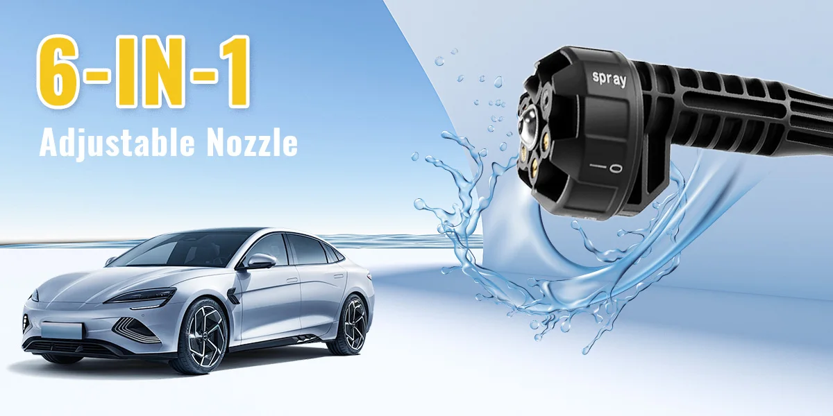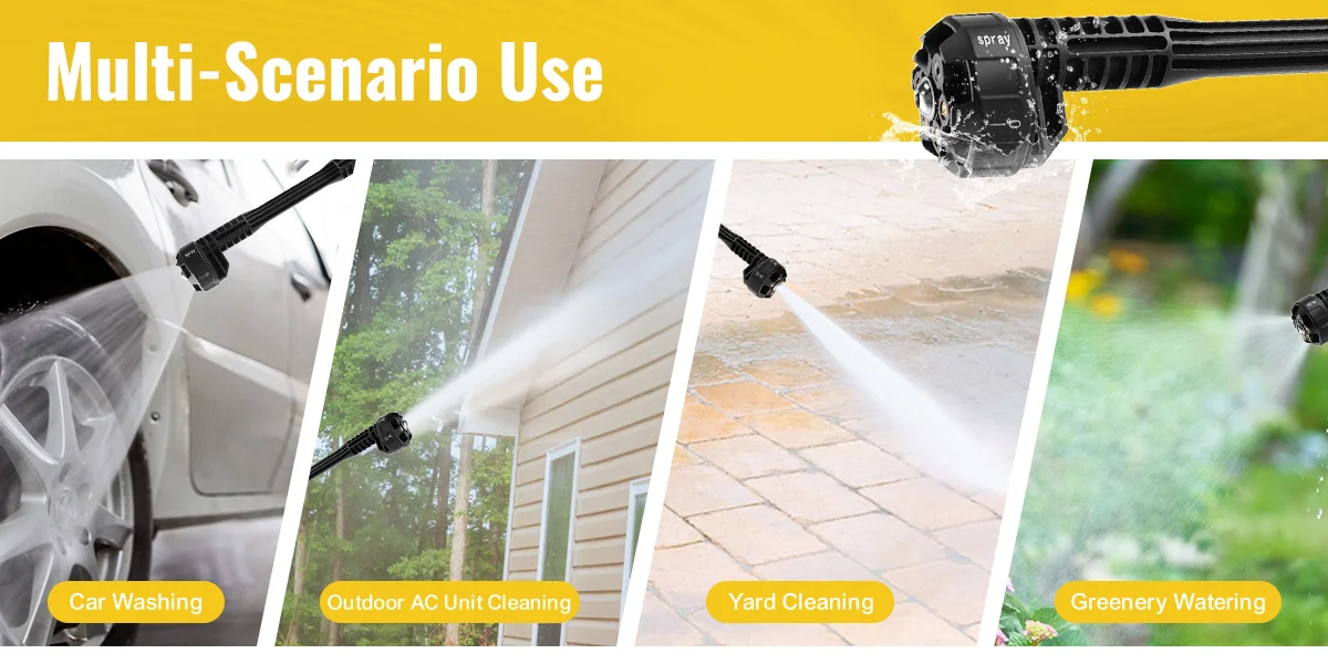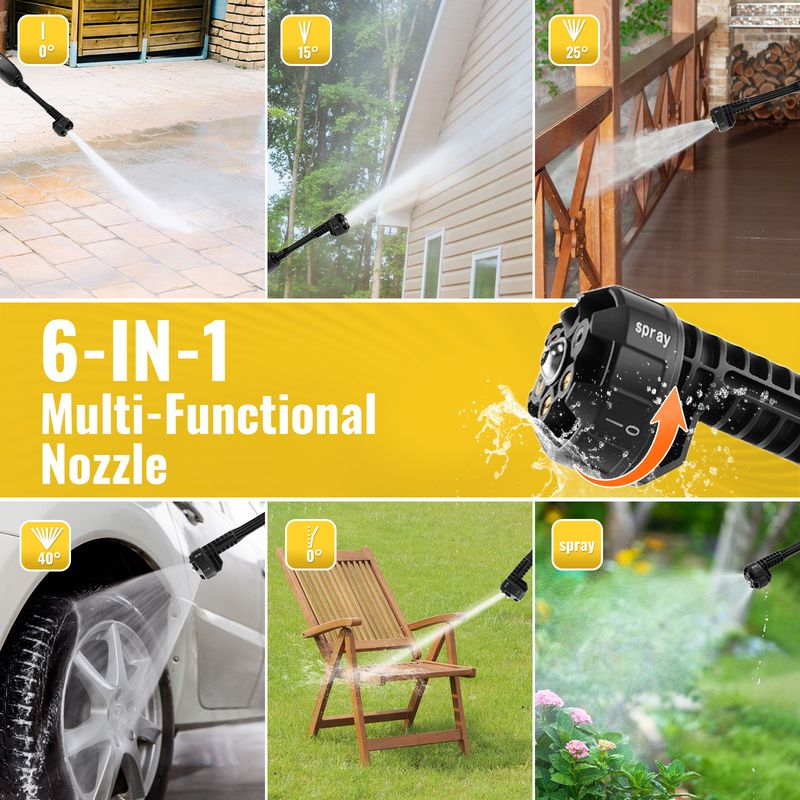1. 6-in-1 nozzle + dual batteries, all-round and efficient: Equipped with a 6-in-1 multi-function nozzle, which can switch between different spray modes; the dual-battery version provides double the battery life, satisfying long-term outdoor cleaning and saying goodbye to frequent charging.