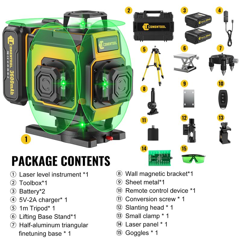 CONENTOOL Laser Level with Tripod, Multifunctional 4D 16 Cross Lines, 360° Rotation Window Self-Leveling, 2 Batteries & Charger