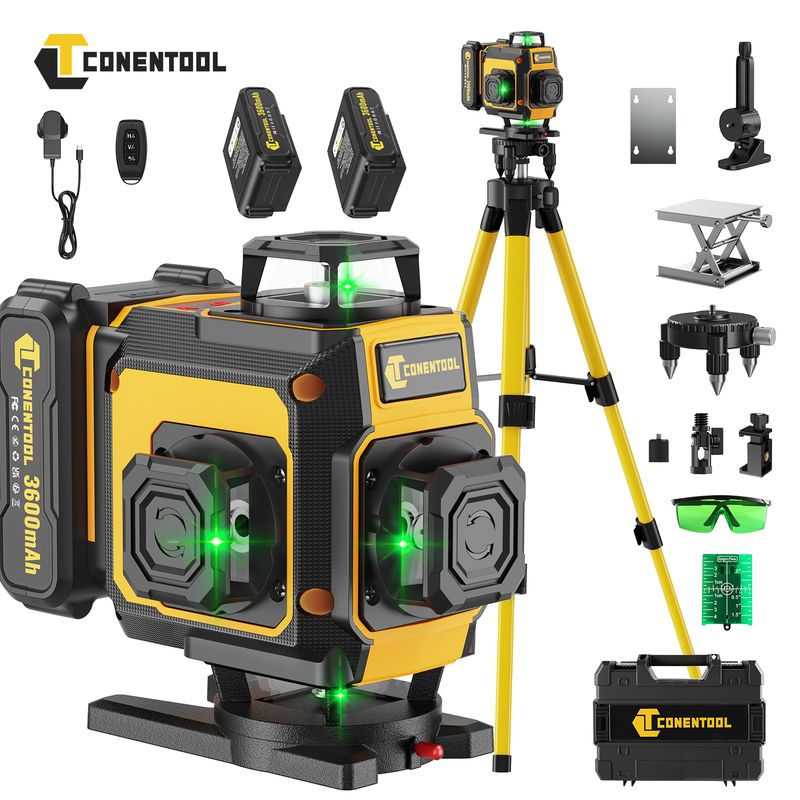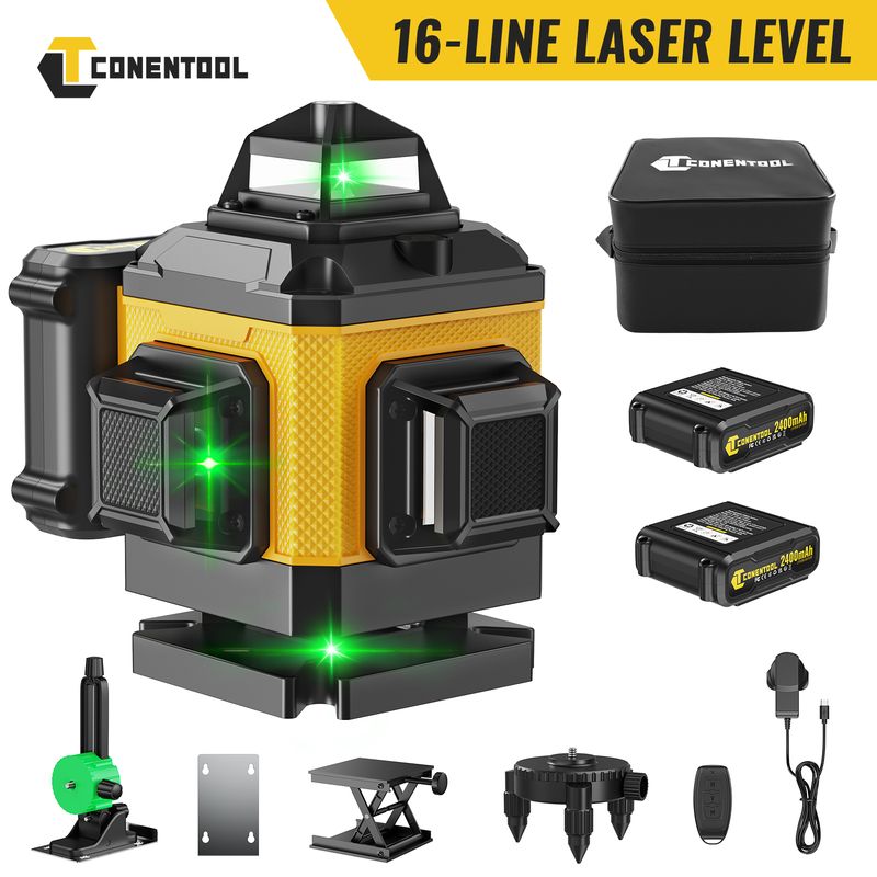 CONENTOOL Laser Level with Tripod, Multifunctional 4D 16 Cross Lines, 360° Rotation Window Self-Leveling, 2 Batteries & Charger
