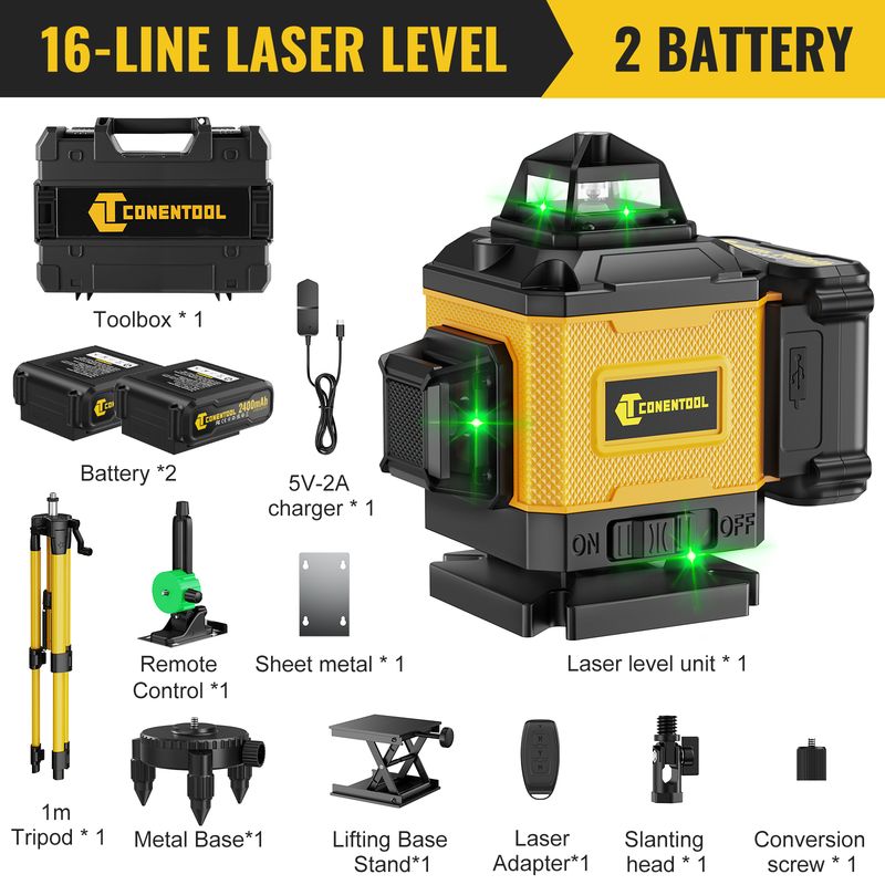 The CONENTOOL 16-line laser combines robust design with an elegant black and yellow look – giving it a professional appearance paired with durability for everyday use. Whether for hobby projects or professional construction sites, this device is your reliable companion in every situation!