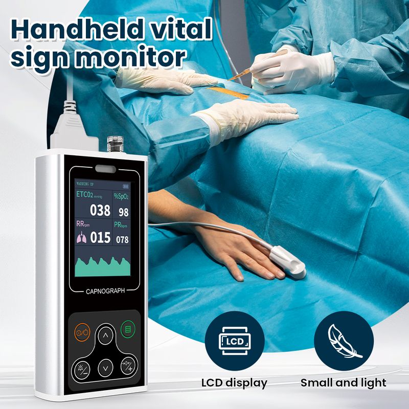 Capnograph adopts sidestream method to measure the end-tidal carbon dioxide, airway respiration rate and other parameters. It can detect pulmonary ventilation function and reflect the circulation and pulmonary blood flow as well as indirectly reflect the alveolar ventilation standard. Meanwhile, it can also detect the blood oxygen saturation and pulse.